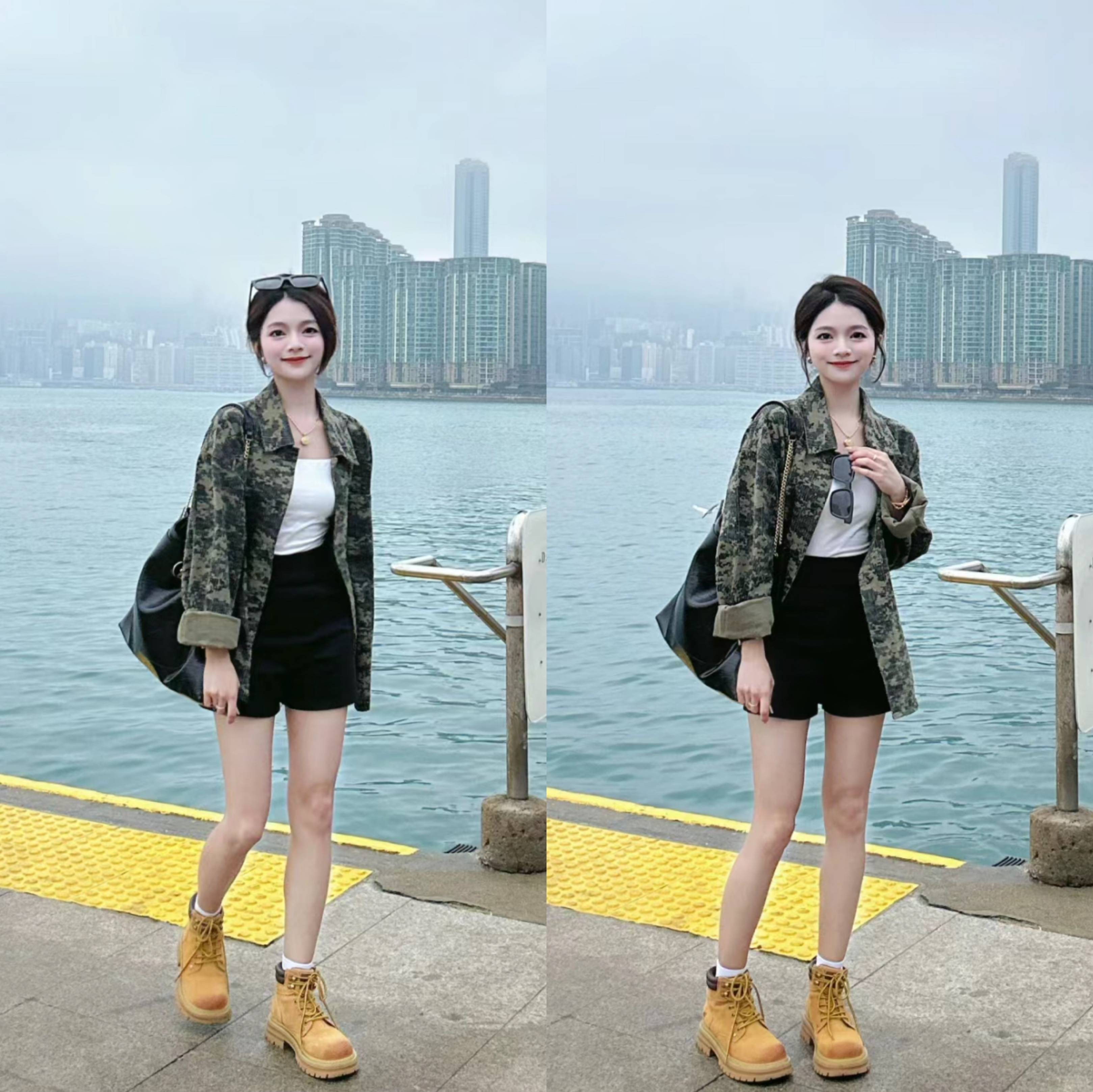 不喜欢太简约的,可以选择带有图案设计的花衬衫作为外套,比如这套,军绿色迷彩衬衫就很好看,内搭白色打底+黑色高腰短裤,经典的黑白配永不过时,黄色马丁短靴为整体造型增加亮点。