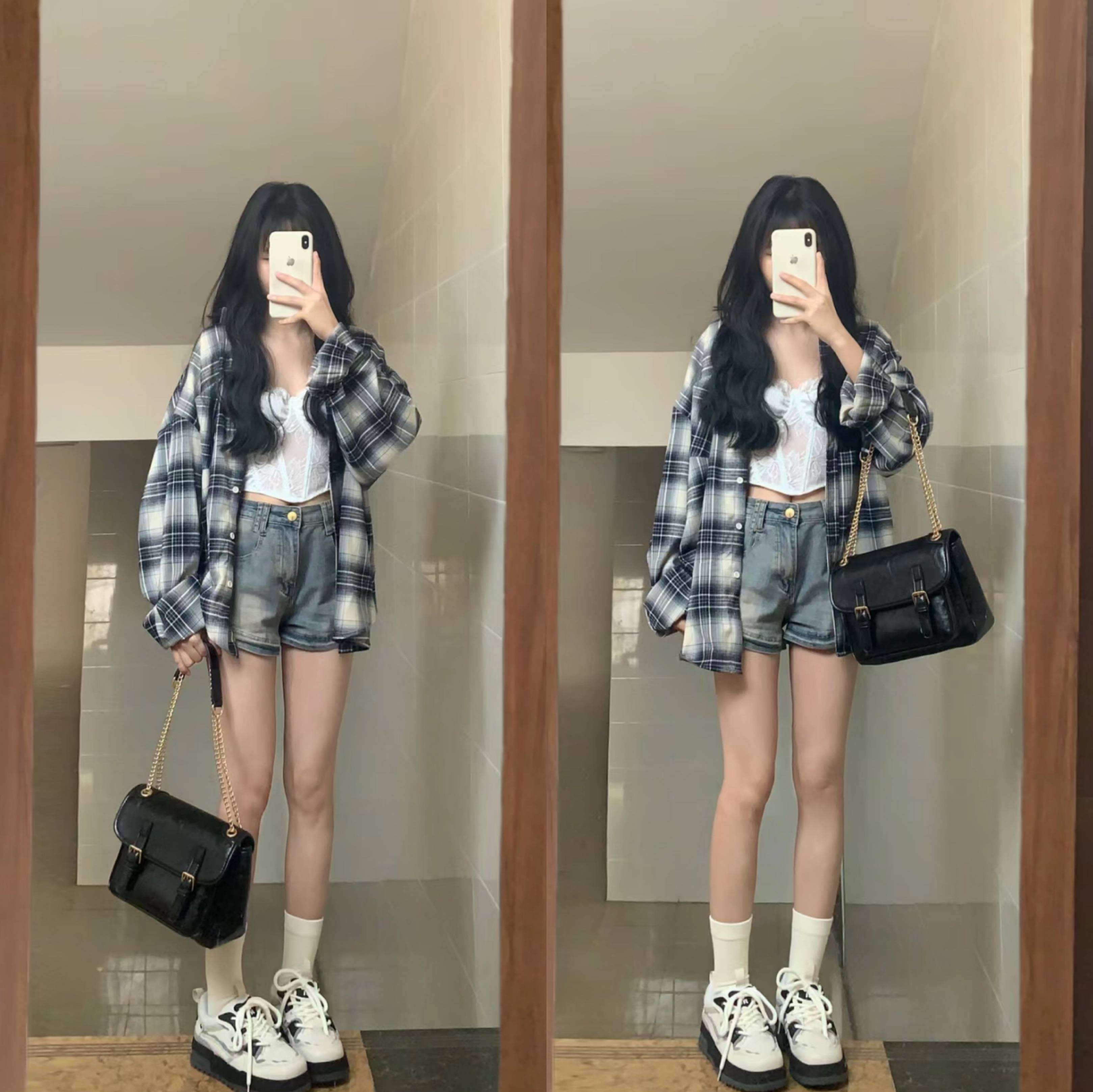 格子衬衫一直都有很多人喜欢,略带复古又不失潮流感,内的露脐吊带,下半身可以搭配高腰牛仔短裤,运动鞋加持,气质休闲随性又能显高显瘦还显腿长。