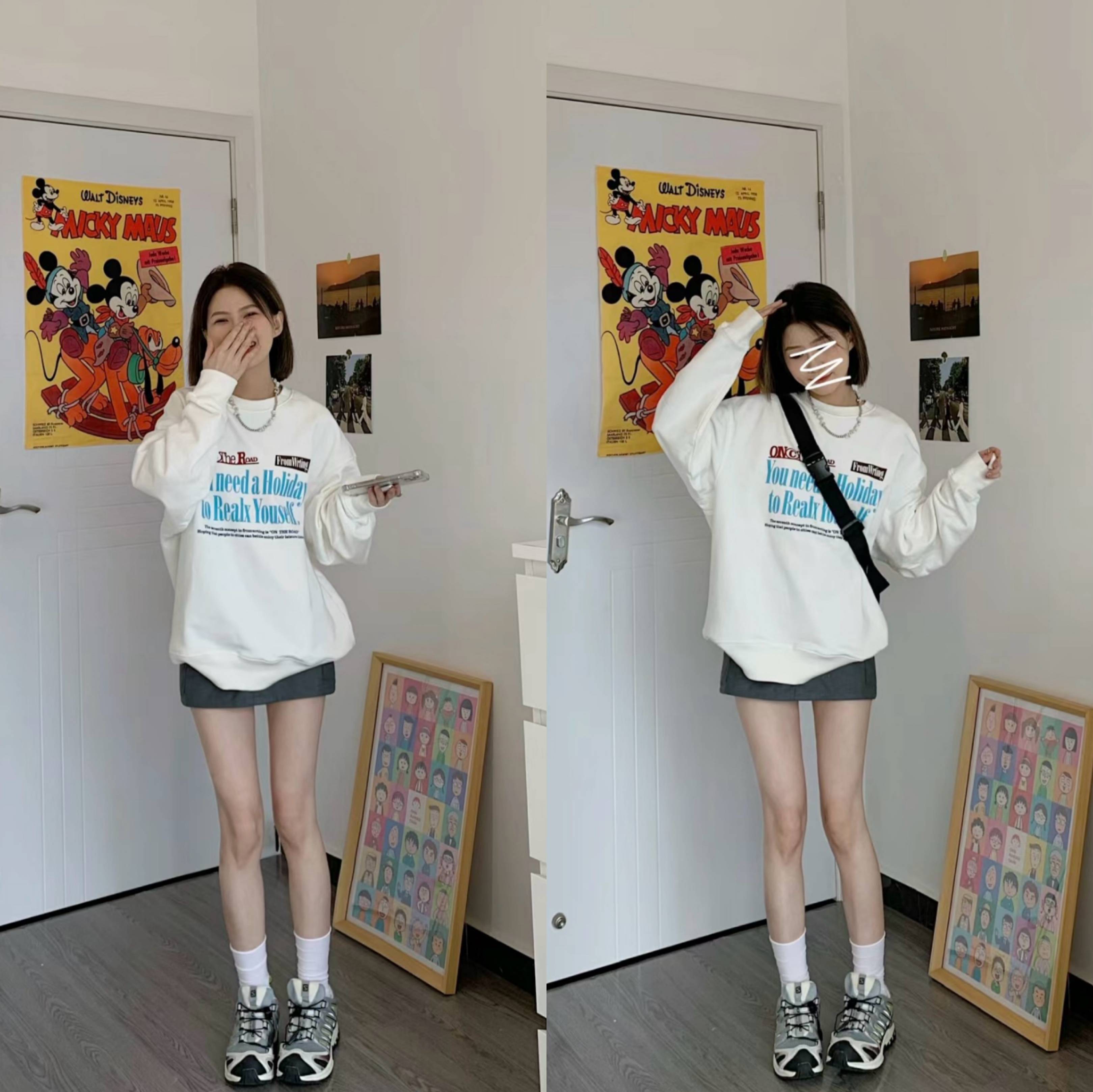 当然最简单的还是“下衣失踪”穿法,大廓形的套头卫衣搭短裙or短裤,虽然没有明示腰线,但可以让下半身的腿看起来更加修长,从而达到显瘦显高的视觉效果。