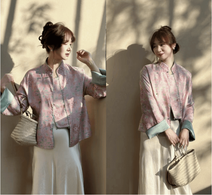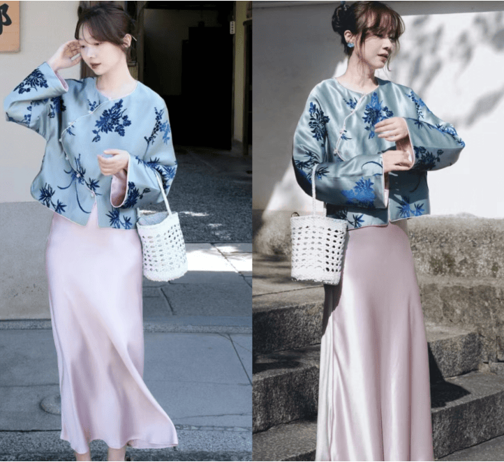比如这组穿搭,运用到的是蓝色的印花上衣和粉色裙装的配合,这样的配色形式其实是较为抓眼的,刚好新中式上衣的外形设计不会繁杂,带来了一些个性。