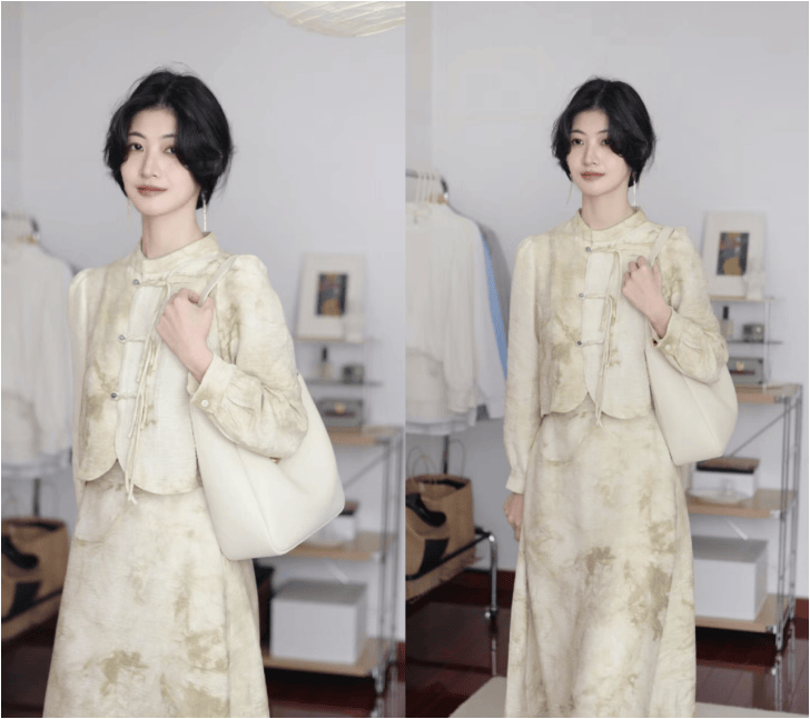 像这套新中式穿搭,利用到的是衬衫和印花裙的结合,裙子对腰部的线条可以进行紧致的刻画,显得身段十分出色。