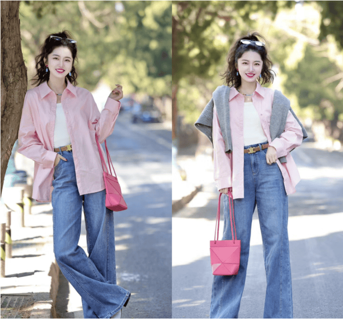 这件粉色的衬衫,一点都不会让人觉得矫揉造作,整体色泽的饱和度低,就会在配色方面减少一些麻烦,用来搭配牛仔裤,青春活力范儿尽显。