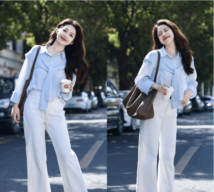 这件颜色干净的蓝色衬衫,应该算是不少女性不管在日常生活中还是在工作的场景之中,都喜欢运用的单品,尤其是匹配了白色长裤之后,更是能让配色呈现的干净清澈的感觉,发挥的淋漓尽致。
