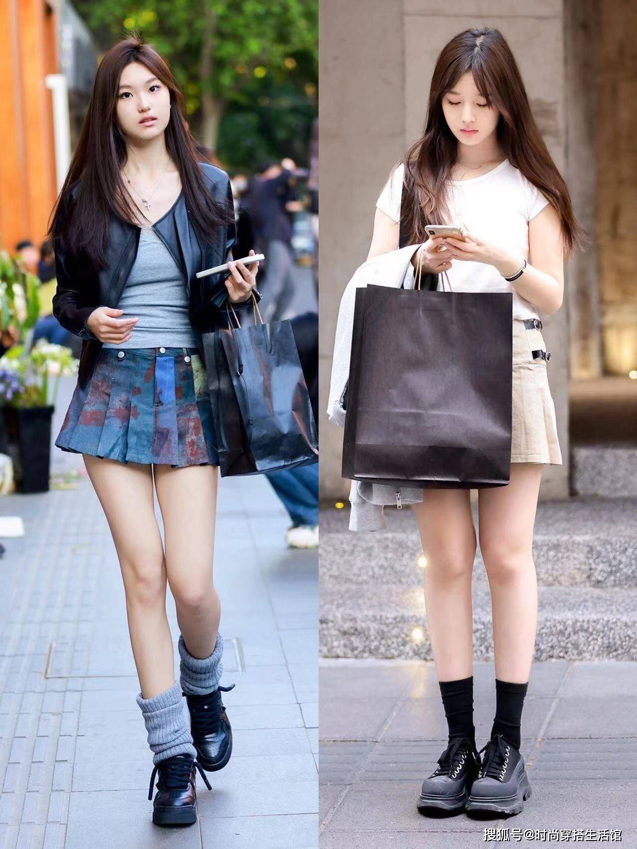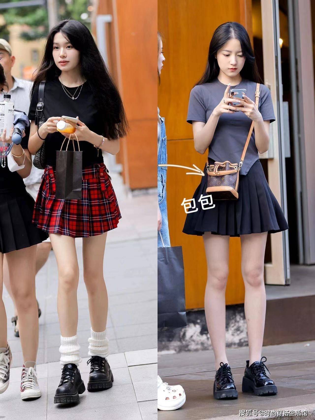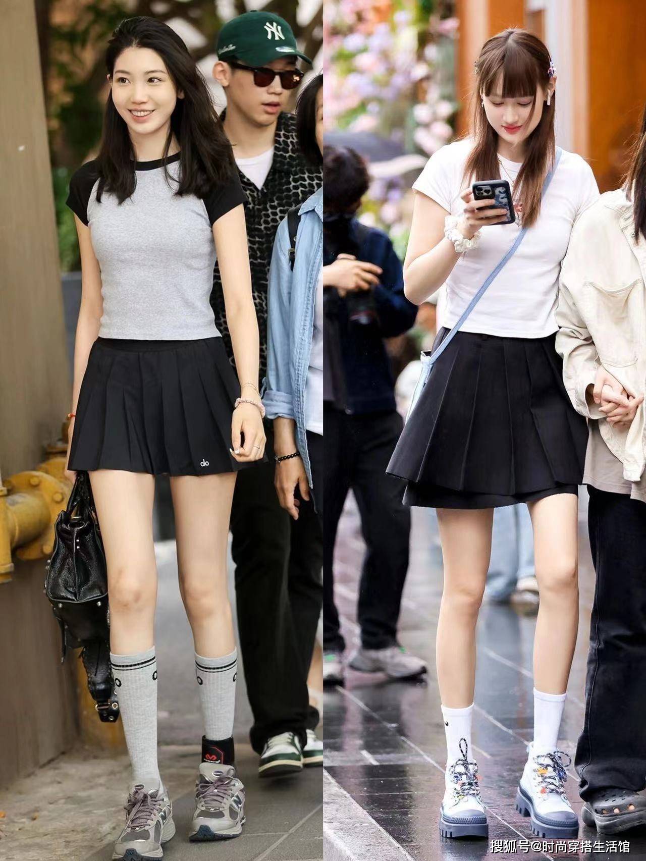 A字裙,比较修饰腿型,腰身最细,裙摆略宽,可以修饰胯宽等问题。如果选择膝盖上面的超短A字裙,减龄又显瘦,选牛仔材质,上身会更有型!记得要把T恤的下摆塞进裙子里,显高翻倍!