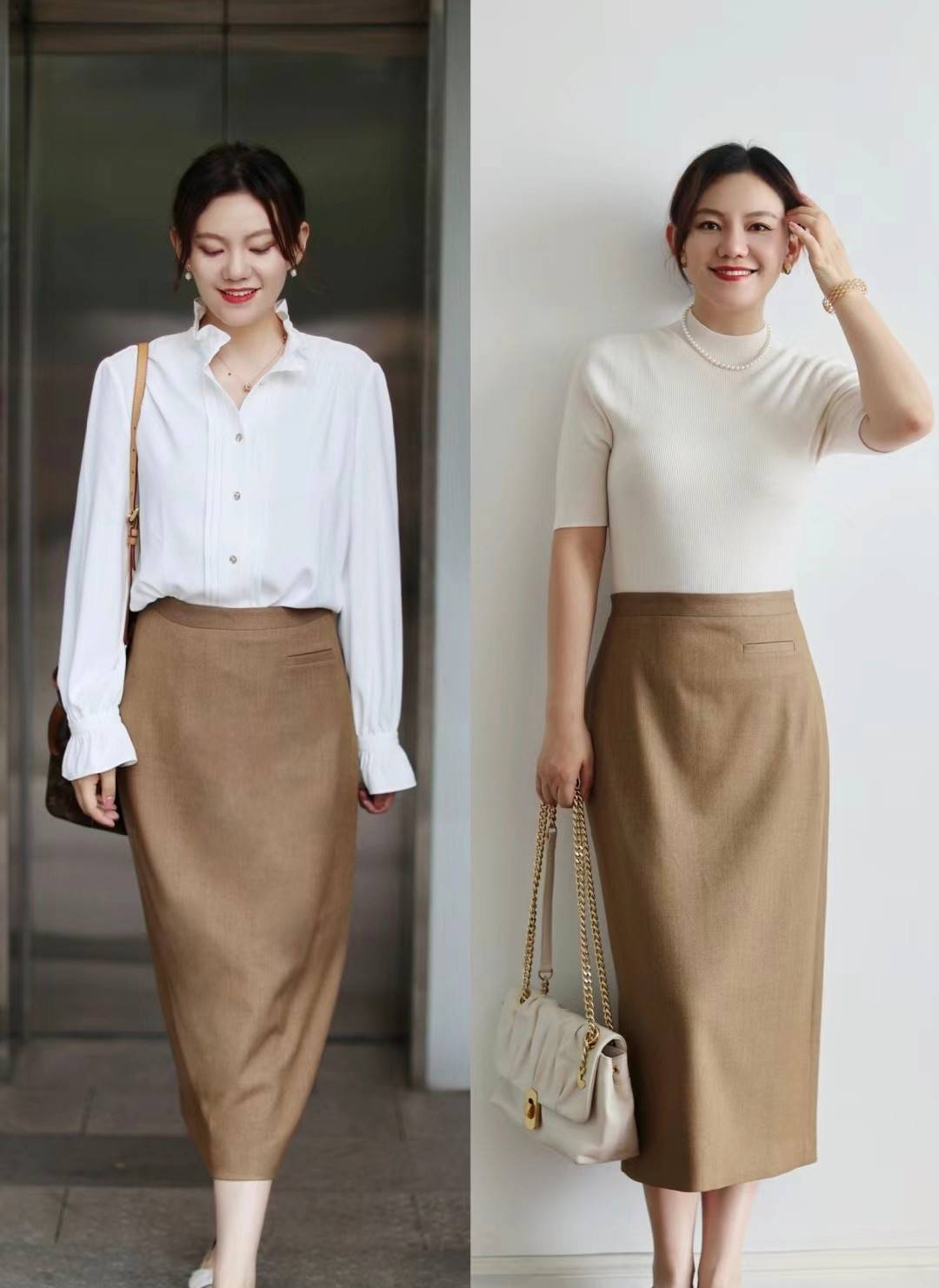 一件白色的衬衫,总是能够呈现出最广泛的包容性,用来匹配包臀类型的半身裙,就会很有职场人士的风范。