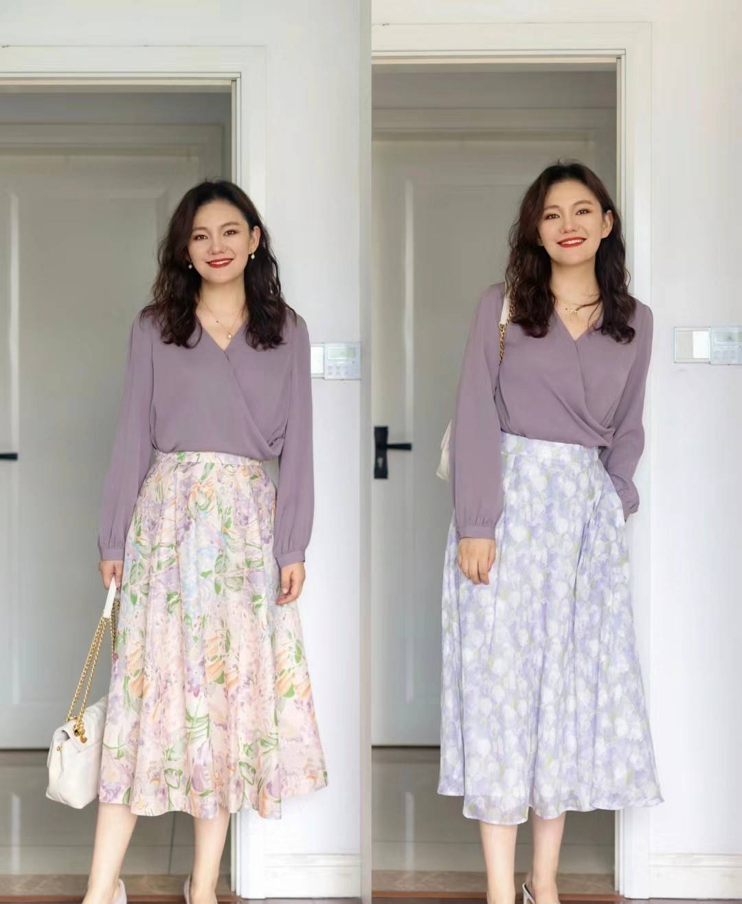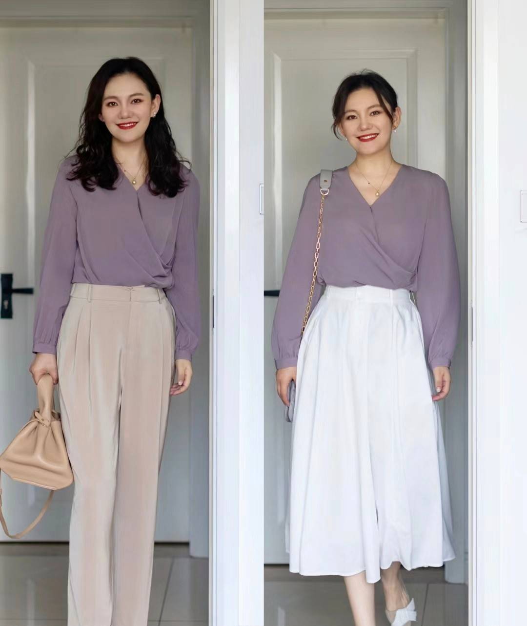 像这件紫色的衬衫,它可以用来结合燕麦色的长裤,也可以搭配白色半身裙,前者洒脱大气,后者优雅娴静。