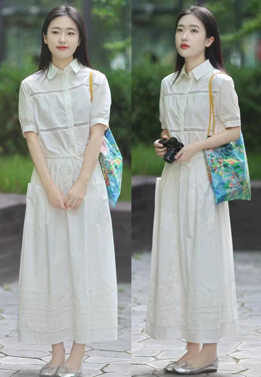 因此这也是白色服装在四季中出镜率都很高的原因,如果觉得短裙对身材比较挑剔的话,也可以试试图中这件白色衬衫连衣裙,显瘦显气质。