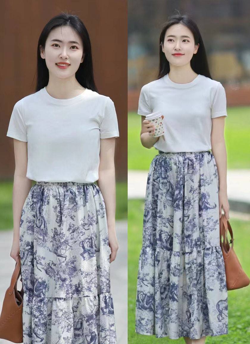 例如上图这件印花半身裙,因为比较繁琐的图案元素,单看的话会显得累赘,这时不妨就以白色T恤搭配,获取视觉上的留白感。