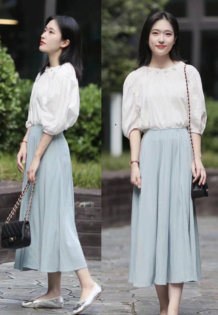 其实除了白色以外,有些彩色也能恰如其分的彰显出清新氛围,但前提是饱和度要调节到合适的程度才行。比方说上图这身夏季穿搭中,应用了白色衬衣与浅蓝色半身裙的配合,将清新感交织在了一起,很完美的塑造出了优雅温婉的气质。