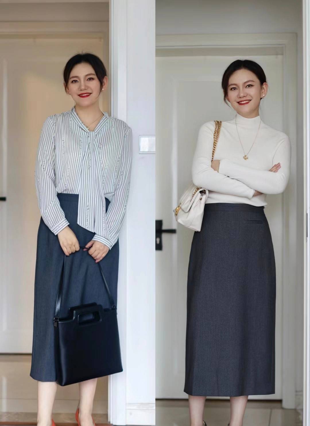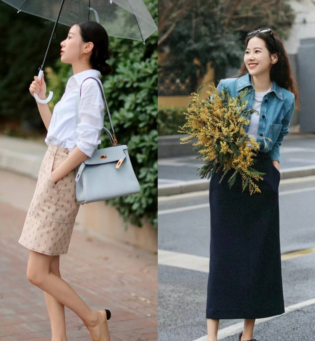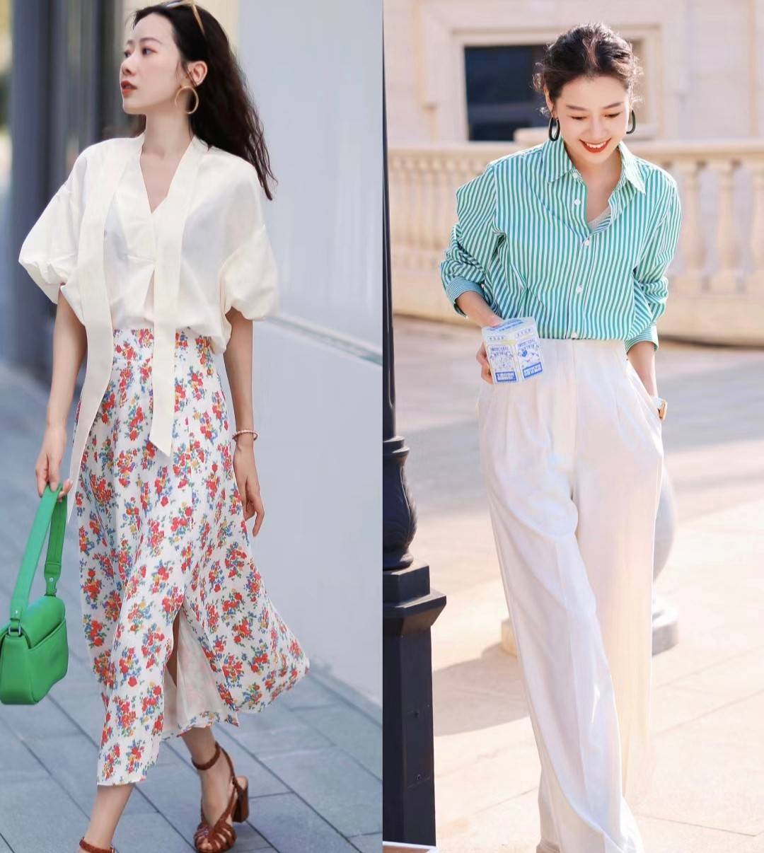 衬衫可以和不同长度的裤装组合在一起,也可以与各种长度的裙子配合。像这两组造型,就能展现出最直接的对比,搭配了短裙之后,对腿型有所展现,组合了长裙之后,看起来更为端庄,对腿部有着较好的遮挡效果,适合不同体型的女性采用。