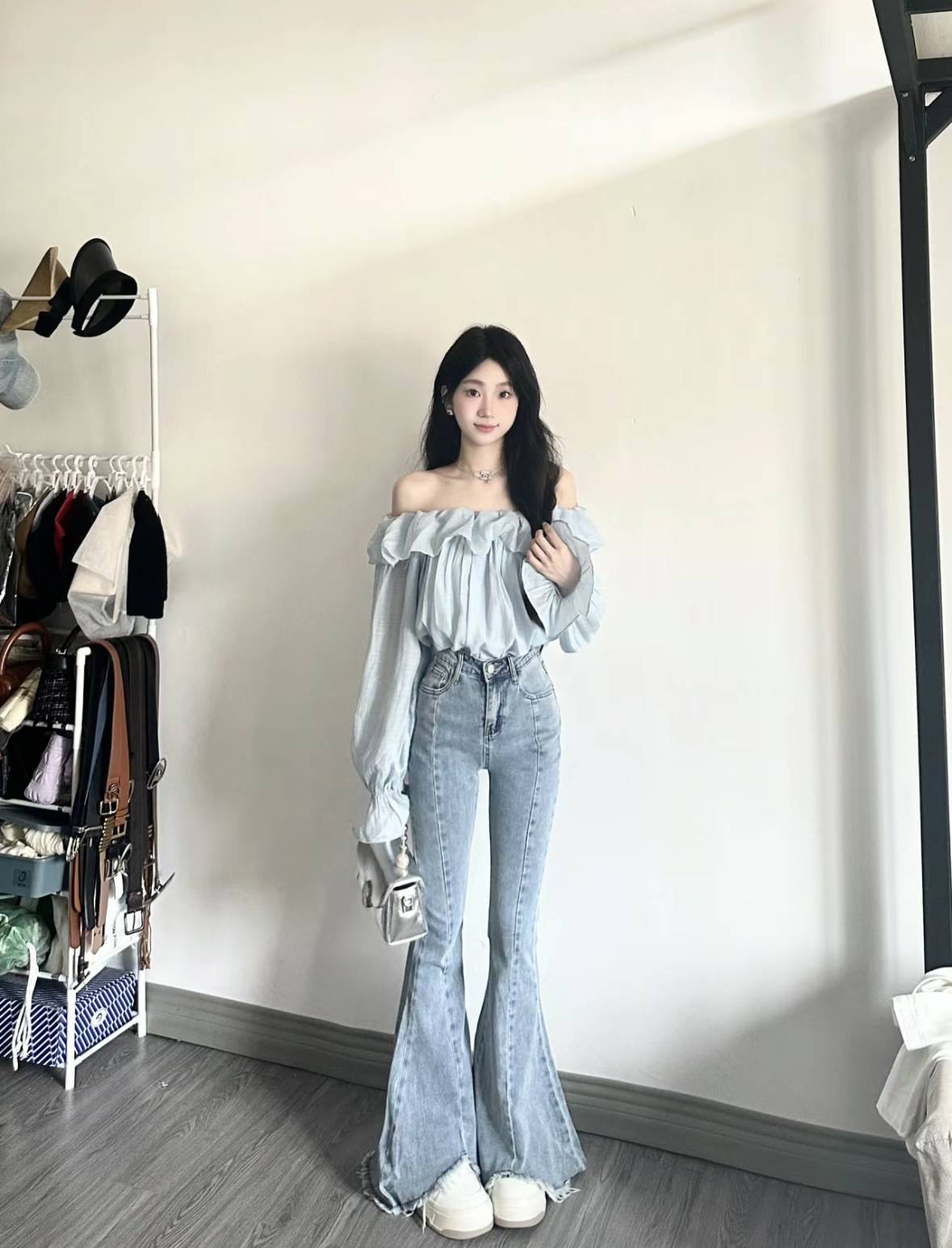 2、甜美风:雪纺衫+微喇牛仔裤+厚底鞋