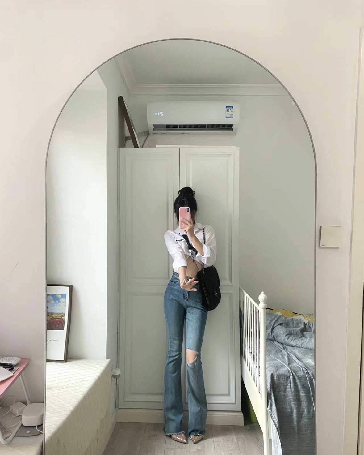 破洞款微喇牛仔裤是夏季的热门选择之一。它打破了传统牛仔裤的沉闷感,为整体造型增添了一抹不羁与个性。破洞的设计位置和大小可以根据个人喜好进行选择,无论是膝盖处的小破洞还是大腿侧面的大破洞,都能为造型增添一份独特的魅力。