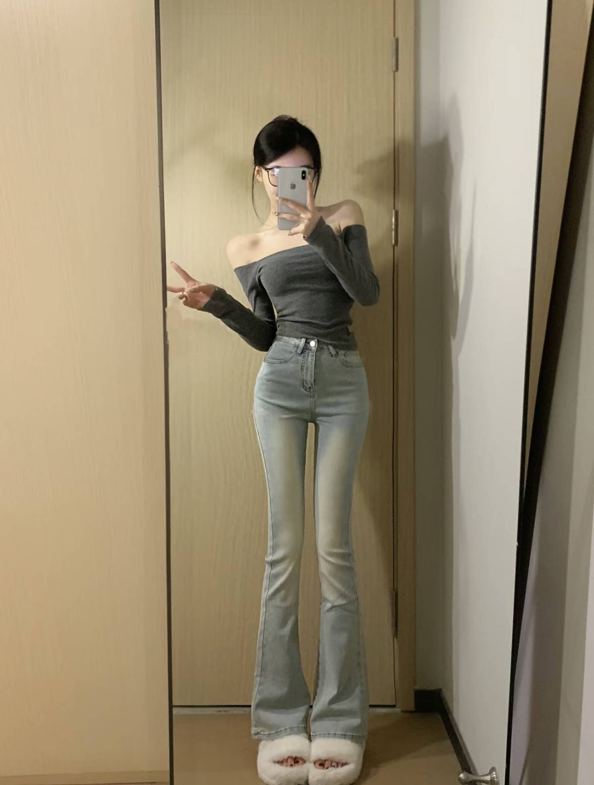 3、性感风:一字肩针织衫+微喇牛仔裤+个性拖鞋