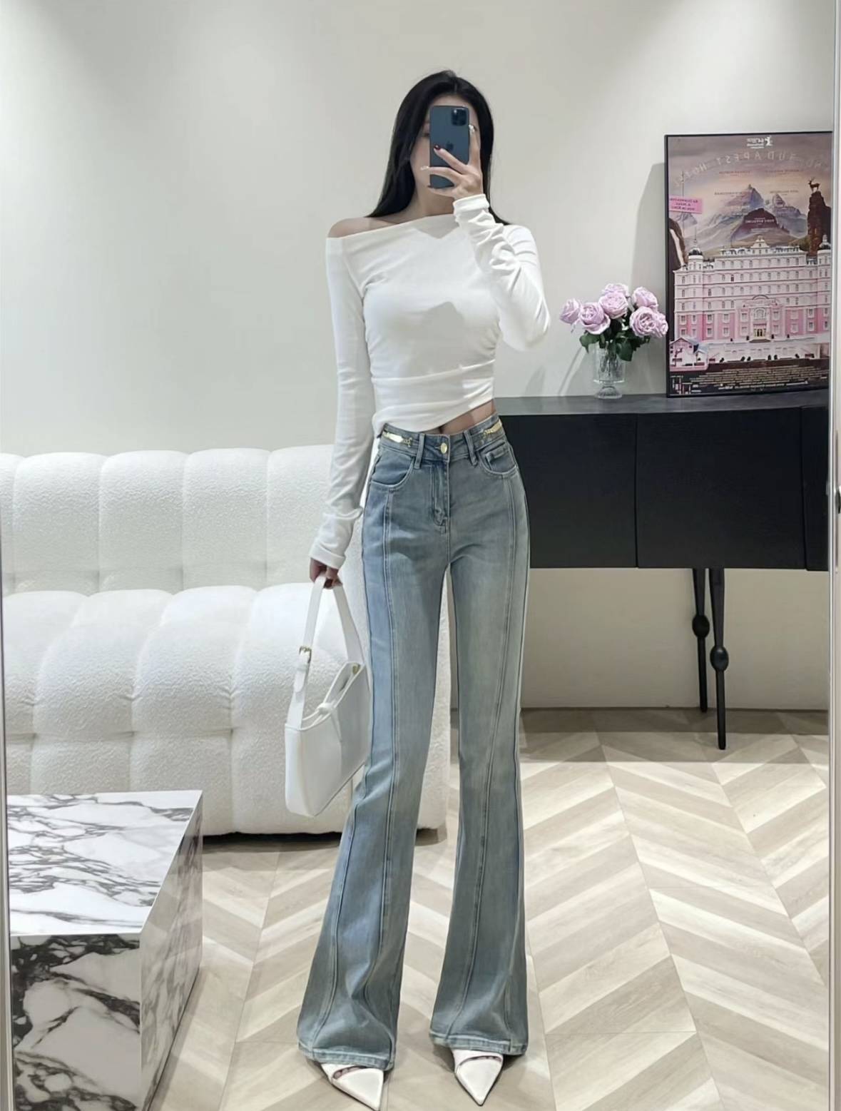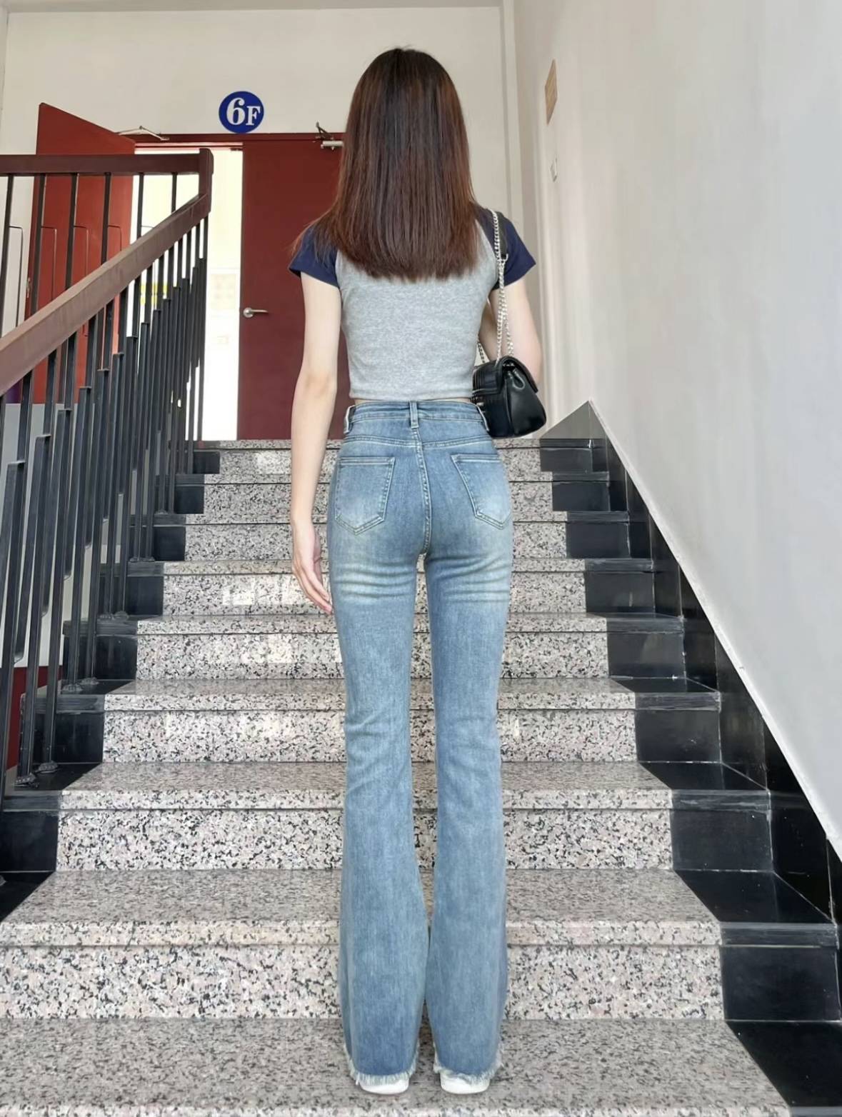 修身直筒型微喇牛仔裤适合身材匀称、腿部线条修长的女性。这种版型的牛仔裤能够完美地勾勒出腿部线条,同时微喇的设计又能增添一丝优雅与时尚感。无论是搭配T恤还是衬衫,都能轻松营造出简约而不简单的时尚感。
