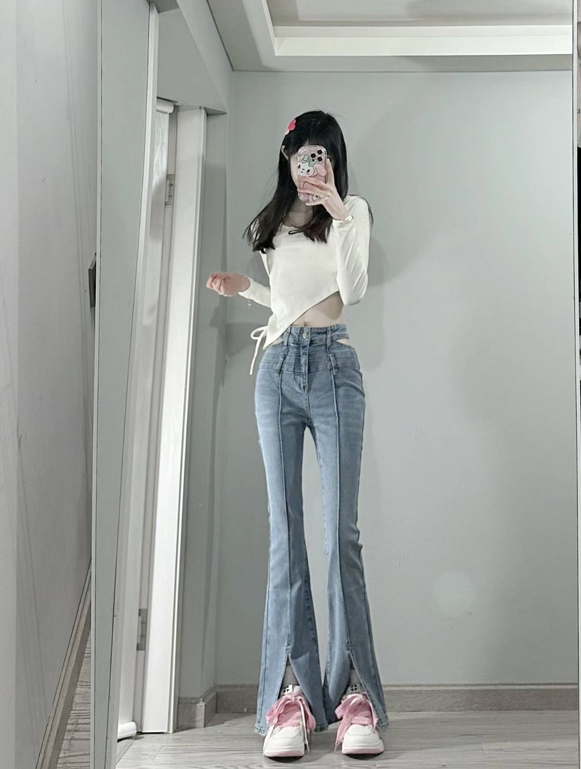 开叉款微喇牛仔裤则更加适合想要显瘦的女性。裤腿的开叉设计能够增添腿部造型的显瘦效果,也能让整体造型不那么单调。选择开叉款微喇牛仔裤时,要注意与上衣的搭配,避免整体造型过于花哨。