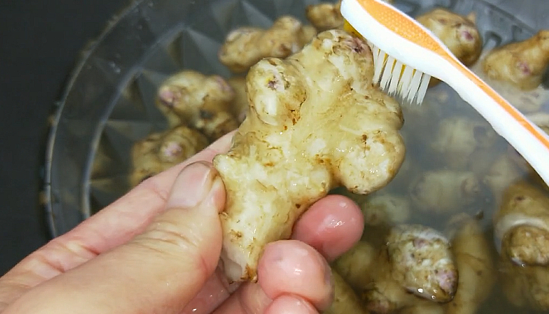 1、洋姜表皮上的泥很多,先放在盆中用水泡半个小时,再用不用的牙刷刷掉上面的泥