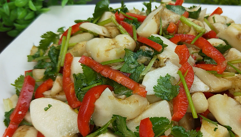 (洋姜一斤,彩椒丝一个,适量的香菜,一勺盐,一勺香醋,一勺生抽,一勺香油,一勺蒜泥)