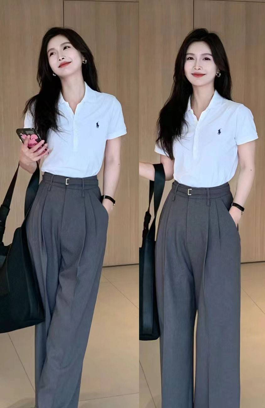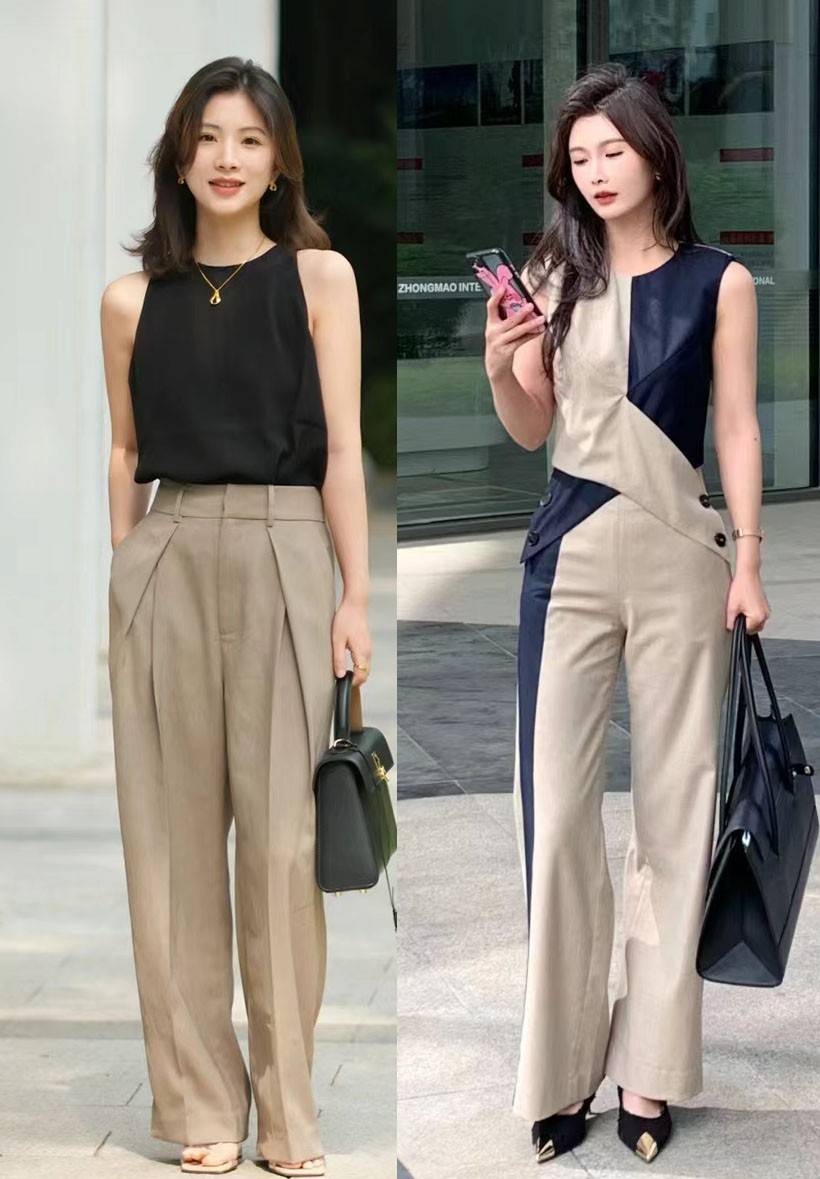 如果可以使阔腿裤穿搭呈现出腰线的话,那么大部分女士都可以稳妥驾驭出时尚感。而到了夏天之中,并不太推荐采用九分之类的裤脚长度,不怎么显腿长。