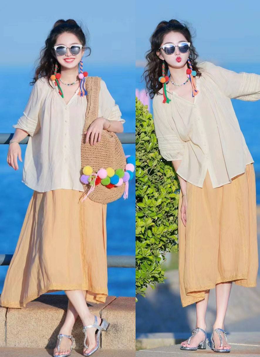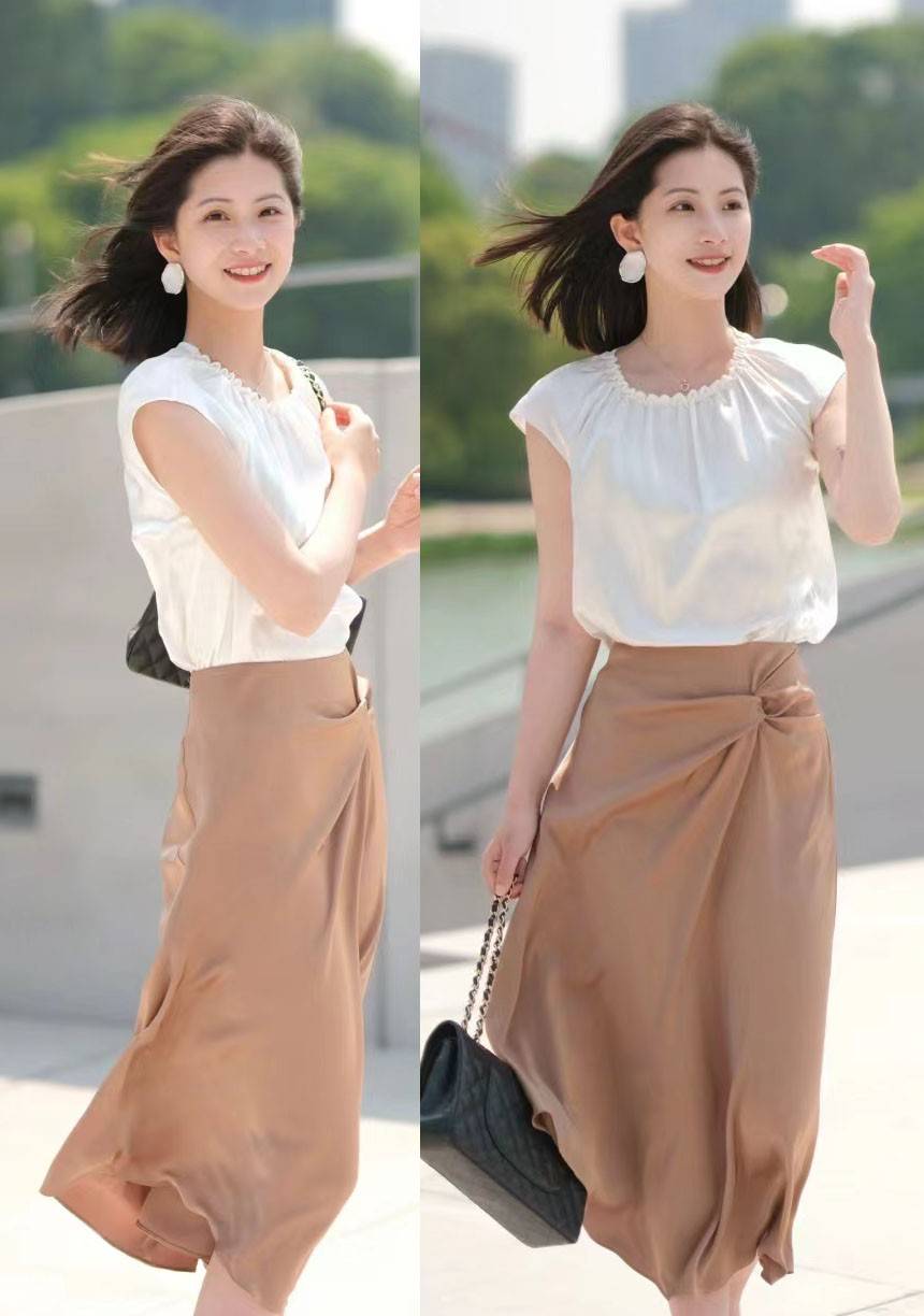 这种“衬衫+半身裙”的穿法,在夏季也有着比较广泛的应用,而且从图中也能看出,浅色呈现出的柔和感,与轻薄面料结合到一起时,可以使外观展现出显而易见的轻盈与时尚,非常的适合提升脸部气色。