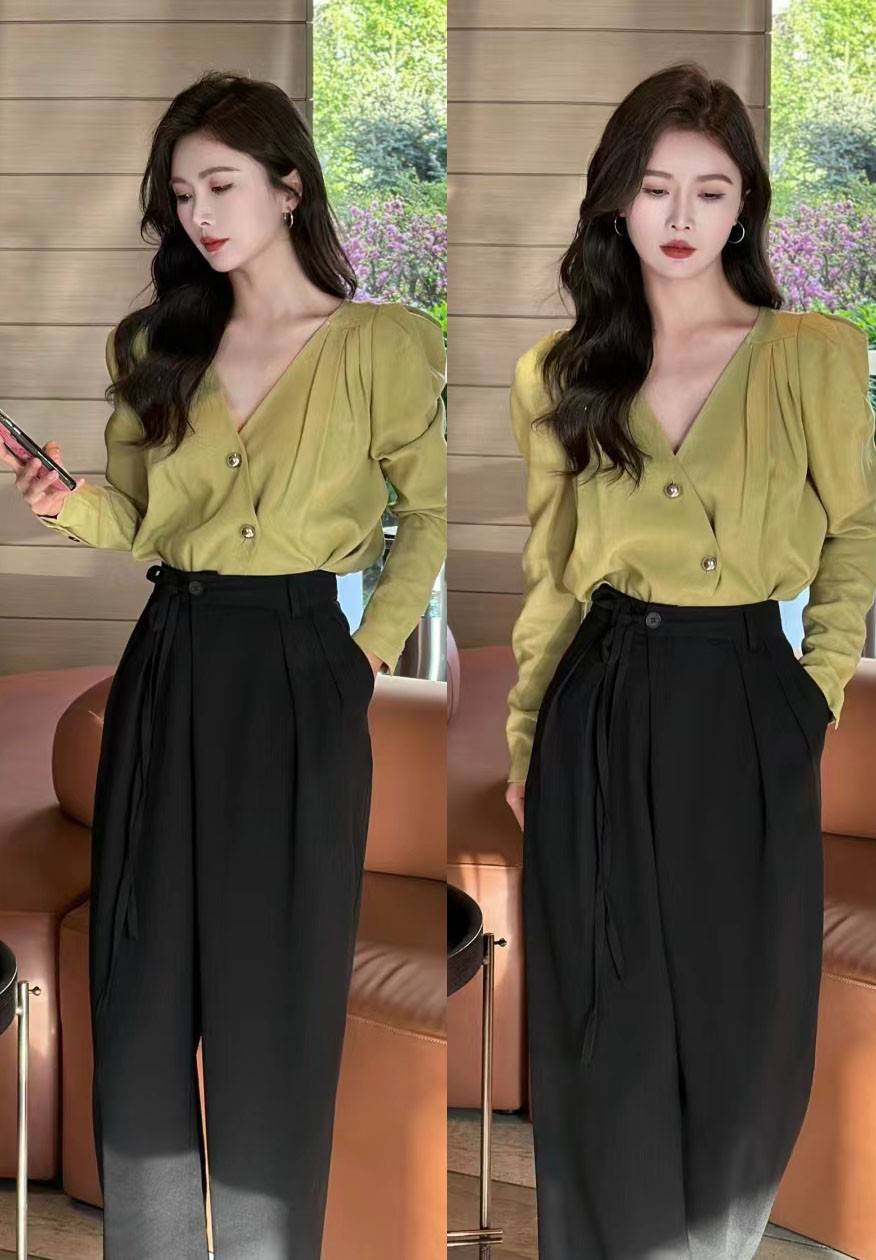 而与上装在搭配时,如果匹配的是图中这种偏长的上装,记得要将衣角塞一下,才能在视觉上调高腰线,协调阔腿裤带来的拖沓感。