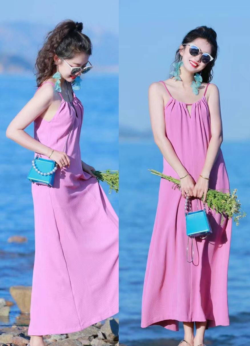 就像是图中这位博主采用的吊带连衣裙,在配色方面就应用了甜美感十足的粉色,但是因为有充沛的露肤度,看上去不会特别甜腻,反而是清透又温柔。