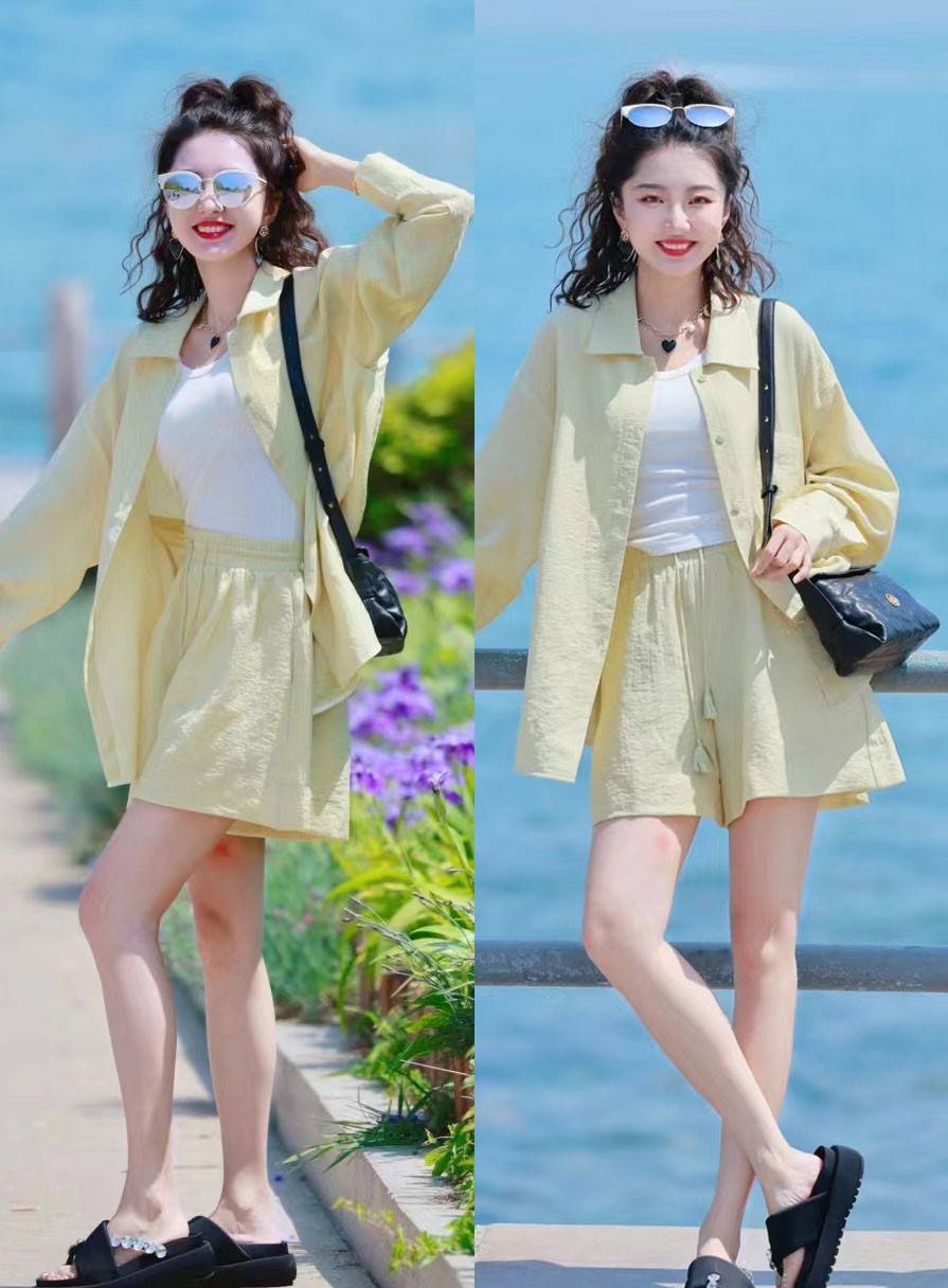 比方说这一件浅黄色的衬衫,这位女士就选择了与白色背心的搭配方式,叠穿呈现出了层次感,而两者版型的对比,又可以使造型一并收获松弛感与利落感。