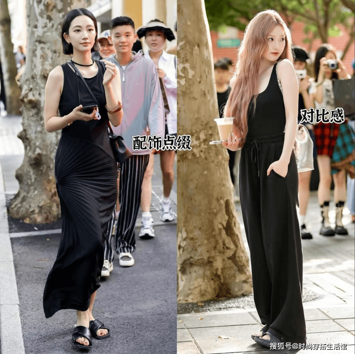 夏季在选择西裤和运动鞋的造型时,为了避免造型显得沉闷,大家也要打造出露肤度来平衡造型。像是选择露肤度比较高的细吊带上衣或者是露肩设计的上衣、挂脖上衣、V领上衣等。增加上半身的呼吸感,能够有效的降低长裤和长裙的厚重感,过分沉闷的属性看起来会更加有夏日氛围。