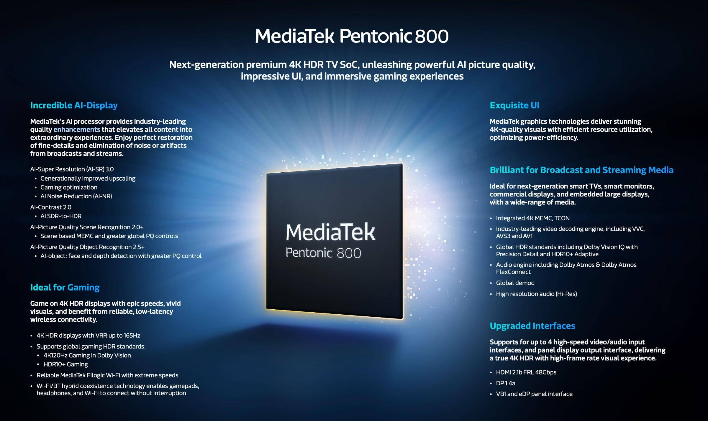Pentonic 800显然是上一代的Pentonic 700的后继者,采用P700的电视在2023年大量推出,主要是国内电视厂商使用,包括TCL、海信、创维、小米等头部厂商。联发科宣布,Pentonic 800 提供一流的视频、音频和云游戏体验。这颗SoC非常适合各种 4K 显示器,包括智能电视、智能显示器、商用显示器和嵌入式大显示器。与上一代芯片相比,联发科的P800的AI 处理速度提高了 50%。