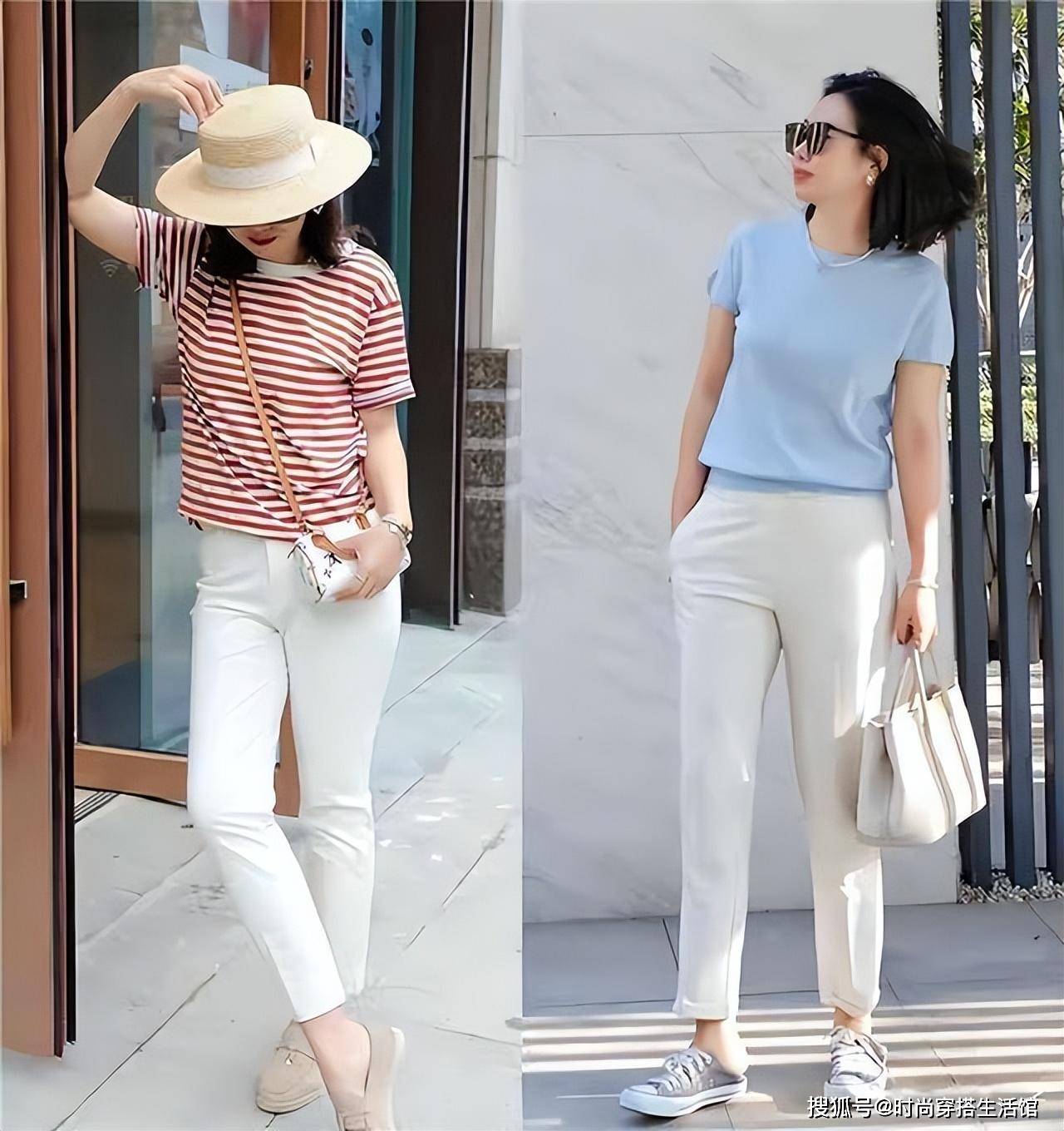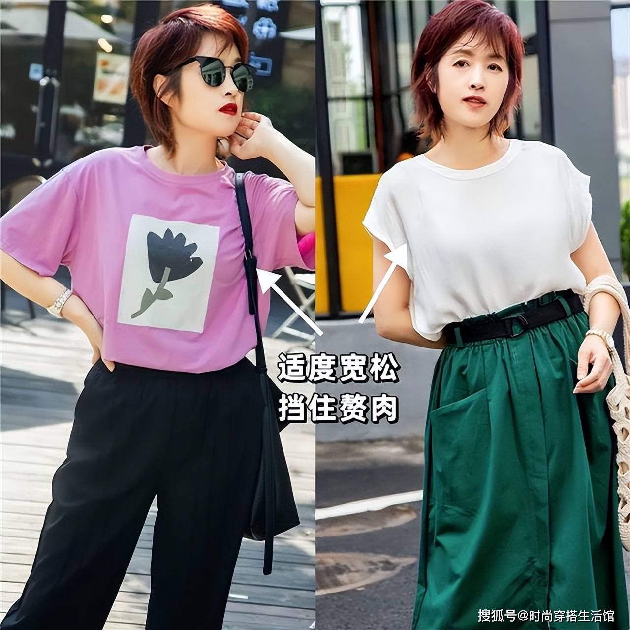 中年女性T恤的选择重点在于修饰身形,而适合大部分人的T恤就是选择正肩线+宽松的版型,这样的T恤就修饰身形又得体百搭。另外要注意的是对于上半身比较胖的女性,选择v领、大圆领或方领会更显瘦。