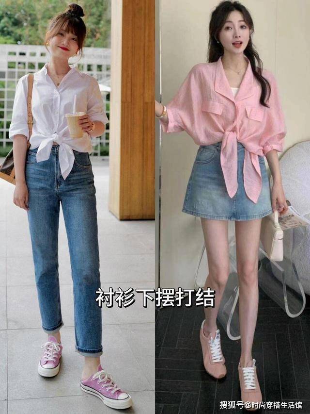 最后一种就是衬衫打结的方式,大家也知道衬衫可以敞开穿,也可以将纽扣扣起来,如果你想要显得身材好,那么你可以将纽扣起来的同时将衣摆留出来,然后再将衣角打结,这样的话就能够让衬衫缩短一截,并且拉高腰线。