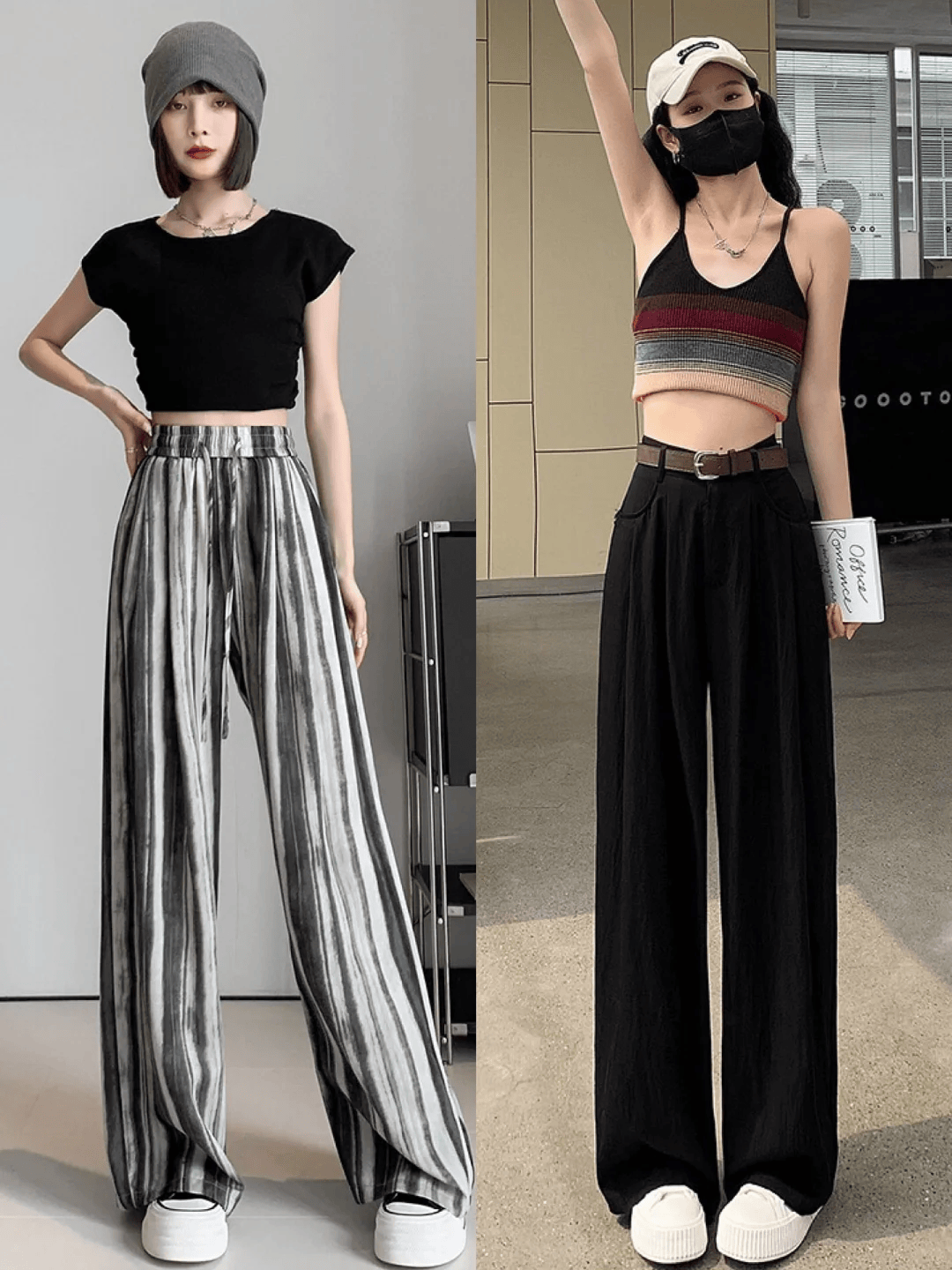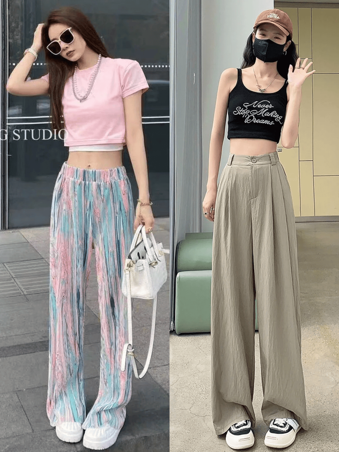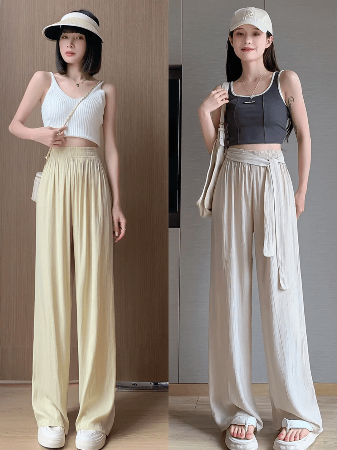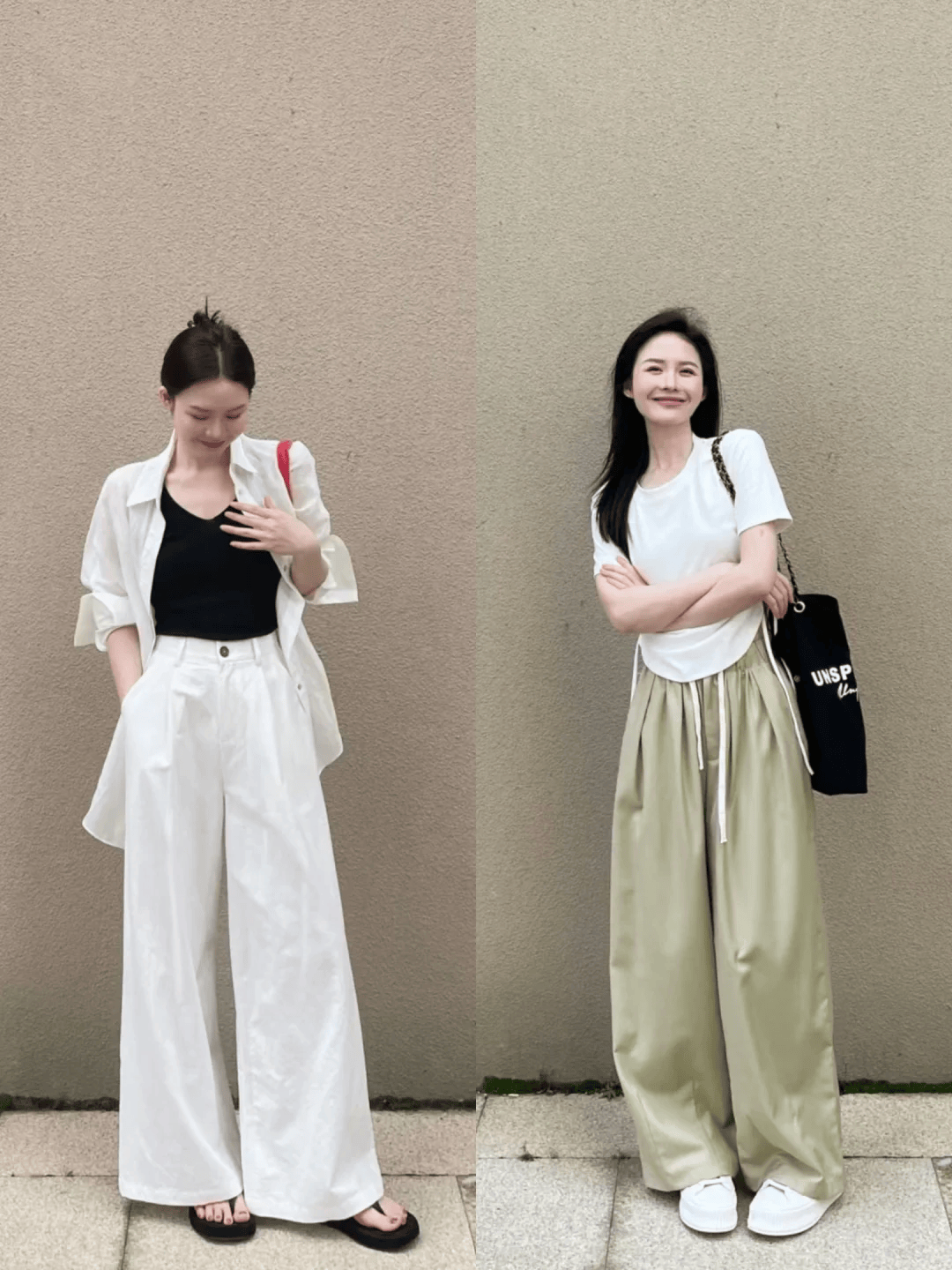 色彩搭配:阔腿裤的色彩选择相对灵活,但深色系(如黑色、深蓝色)通常具有更好的显瘦效果。当然,也可以根据个人喜好和整体风格尝试亮色或印花款式,为夏日增添一抹亮色。