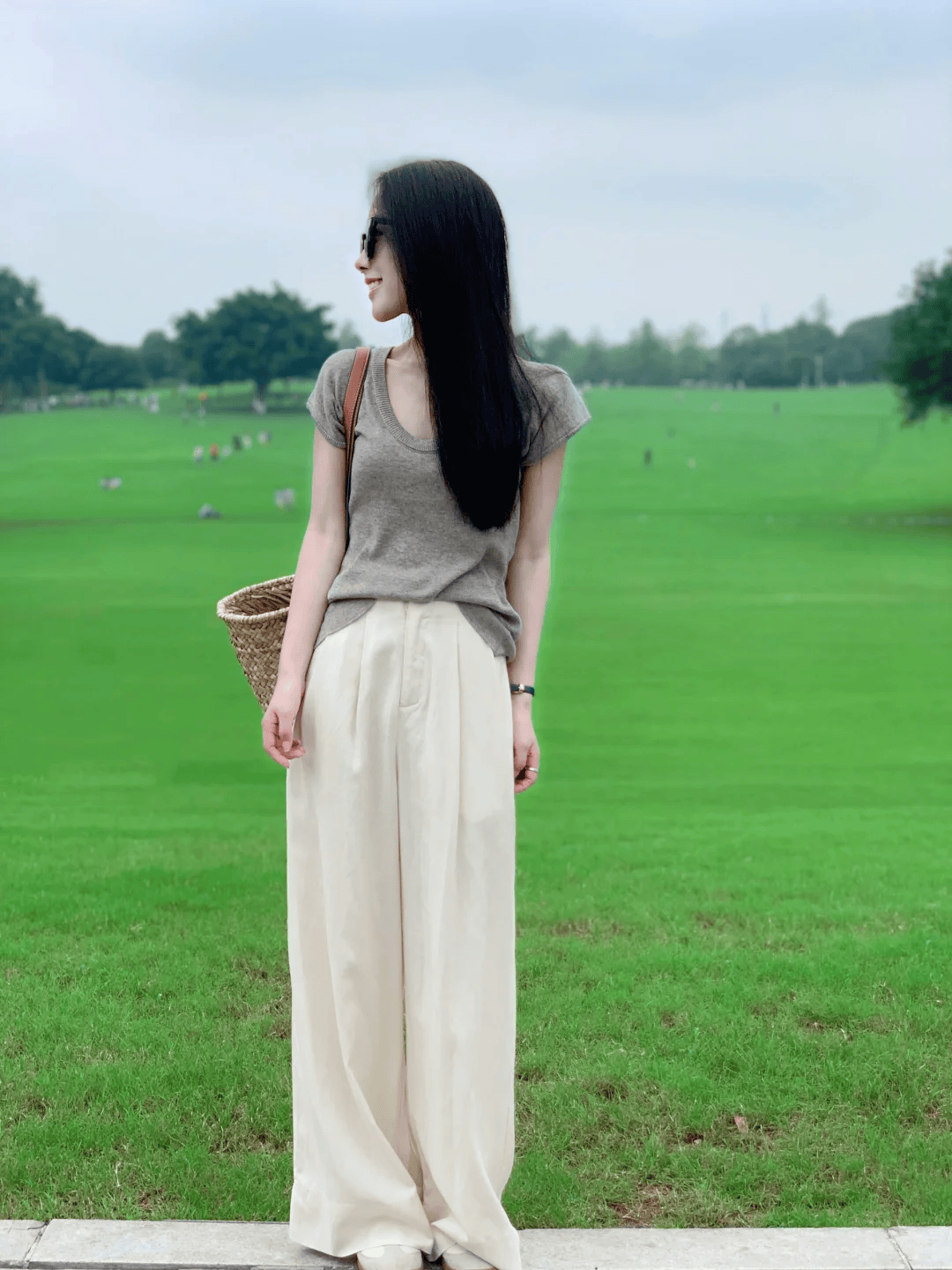 裤子:米白色真丝阔腿裤,真丝的光泽感与垂坠感让裤子看起来更加高级,米白色则与上衣颜色相呼应,整体和谐统一。