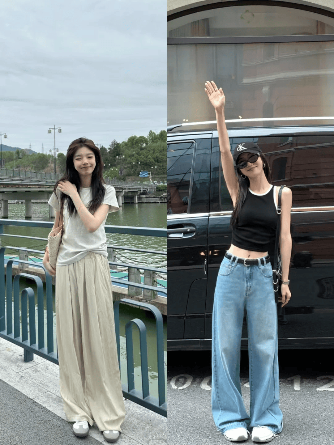 裤子:高腰牛仔阔腿裤,硬朗的牛仔面料与宽松的裤腿形成鲜明对比,既修饰了腿型,又展现出都市女性的干练与帅气。