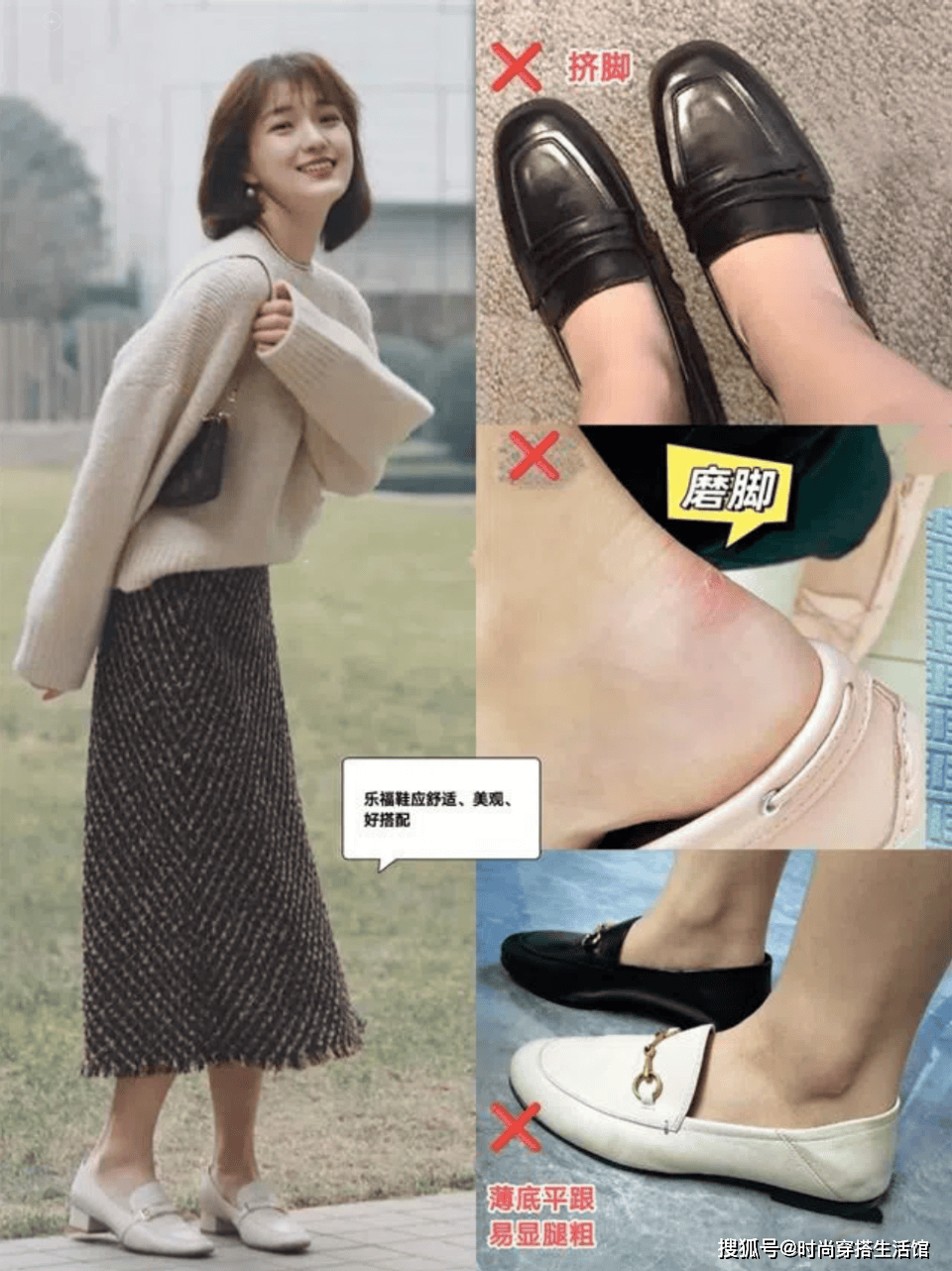 过于浮夸花哨的乐福鞋很挑人又考验搭配,不适合大多数人,颜色上,建议大家就选黑、白、棕这些纯色基础色系,并且在鞋面上也要装饰减弱,避开繁琐设计的乐福鞋,比如鞋面加入铆钉或者各种花哨的纹路,就会显得花哨繁琐,并不是很好搭配哦!