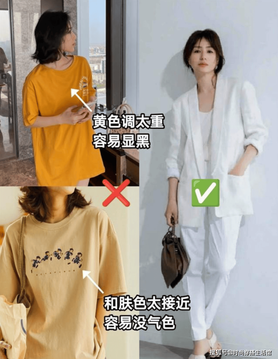 亚洲人的肤色都偏黄一些,尤其上了年纪后,肤色越发暗黄,显得人很没有精气神,如果继续穿黄色调、土色调的衣服,会显得整体更加暗沉,一点都不显白。从浅黄色到棕黄色,建议大家避雷,以免穿错!