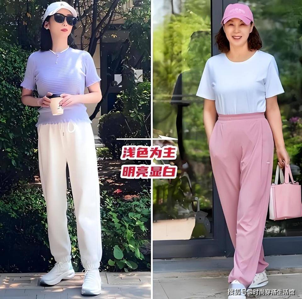 像是选用了薰衣草紫配色的T恤和白色裤子的搭配,或者是用白色T恤搭配上淡粉色的长裤,都能在增添活力感的同时,避免造型显得装嫩。