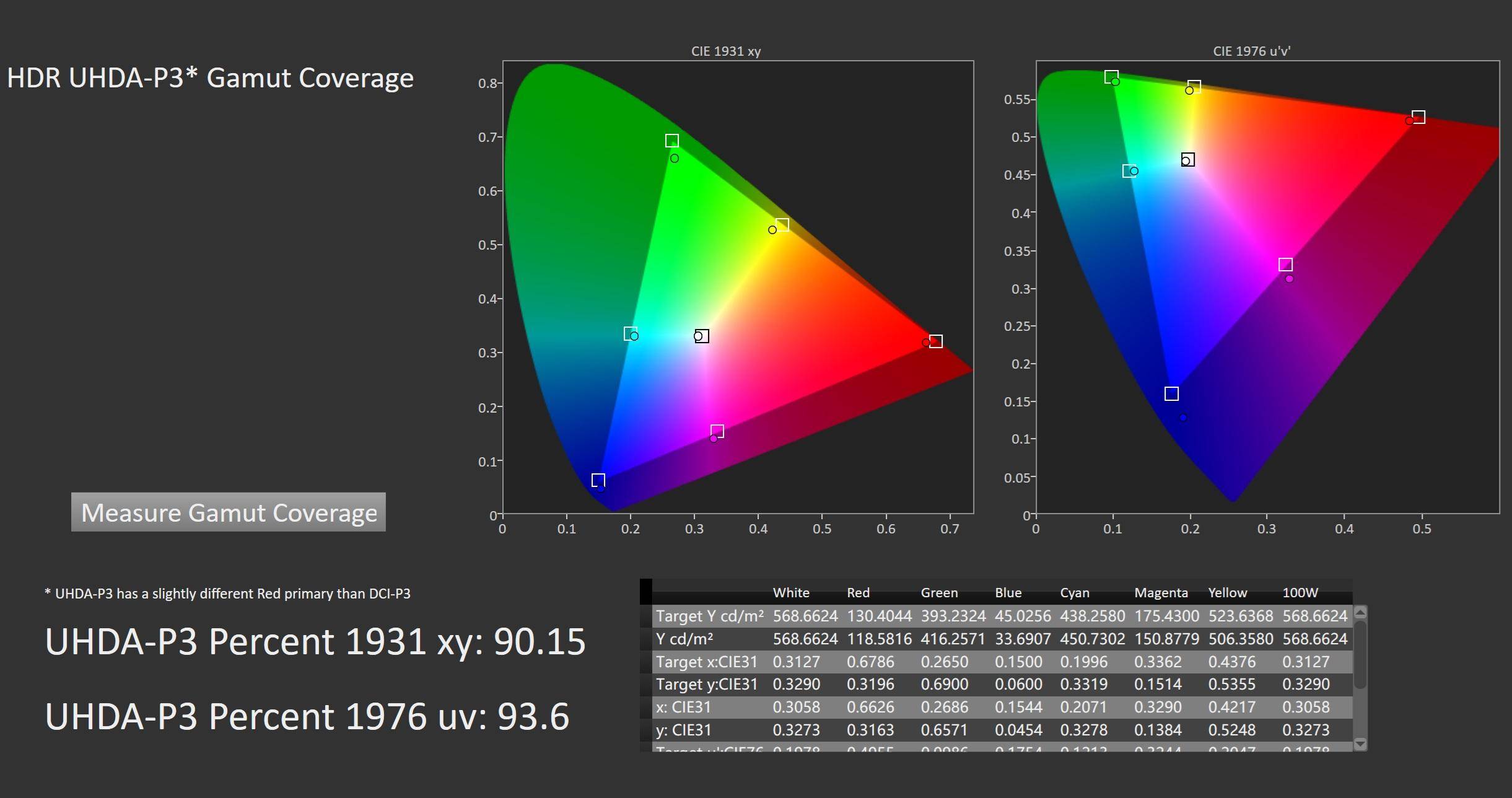 W90A在大多数时候,要比原始信号的亮度更高,无论是SDR还是HDR都是如此,包括我们测试的HDR EOTF曲线图同样是整体高于信号亮度。这在现在的非Mini LED电视上,算是相对普遍的一个显像,因为实在是黑不到最底……不过本身W90A的对比度表现不错,所以整个画面不会被破坏,只是让人感觉极暗的画面似乎不够黑而已。注:请无视右下方的贴纸……