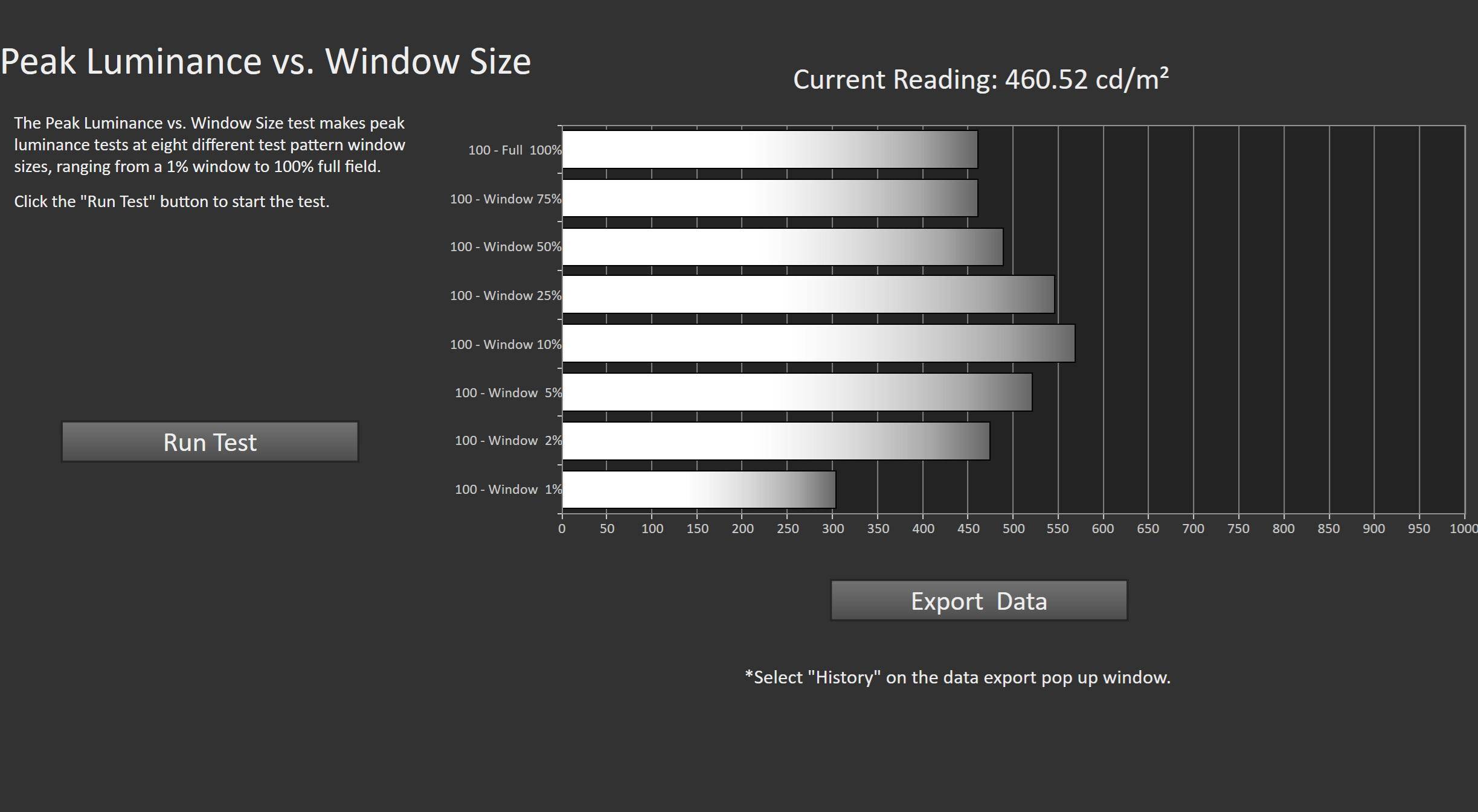 看电视的光谱,没有采用量子点,标准的普通LED电视表现,所以这里专门提一嘴。亮度部分,这款显示器在Filmmker下的峰值亮度在550nits左右,全屏则超过460nits,在小电视中属于佼佼者。当然这只是稳定的峰值亮度,在游戏模式和其他模式下,10%窗口可以瞬间达到700nits的峰值亮度,可能有一些人认为偏低,但这已经是43英寸LCD电视中属于很不错的亮度了,而且如果当显示器用的话,亮度部分会比较舒服!