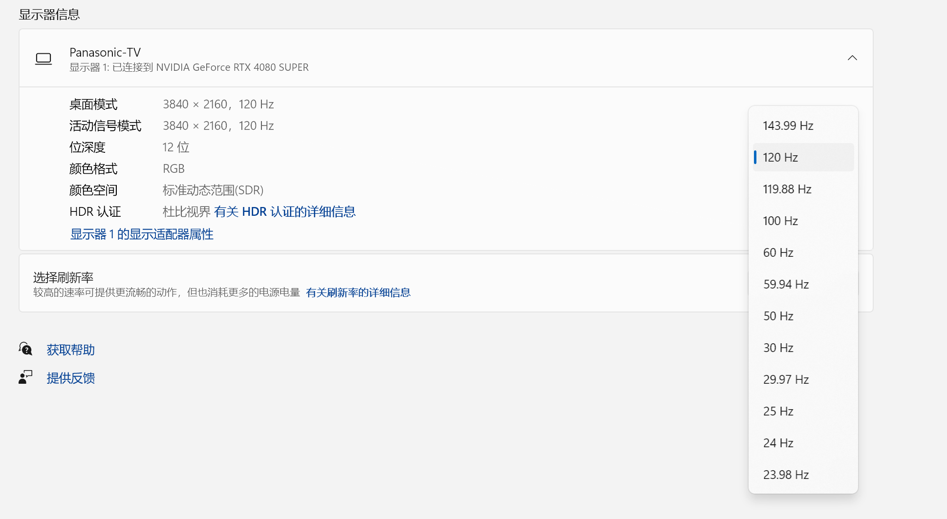 首先W90A最高是支持144Hz的,但是这种144Hz在LCD电视上,我们觉得都有一些问题(貌似就海信的Mini LED电视还比较正常),所以4K/120Hz刷新率是最合适的。我们是RTX 4080 Super的显卡,可以将电视设置为4K/120Hz以及12bit RGB色彩,看起来牛X哄哄,而且联发科P700芯片,完全没有120Hz模糊的问题,用起来比较省心。