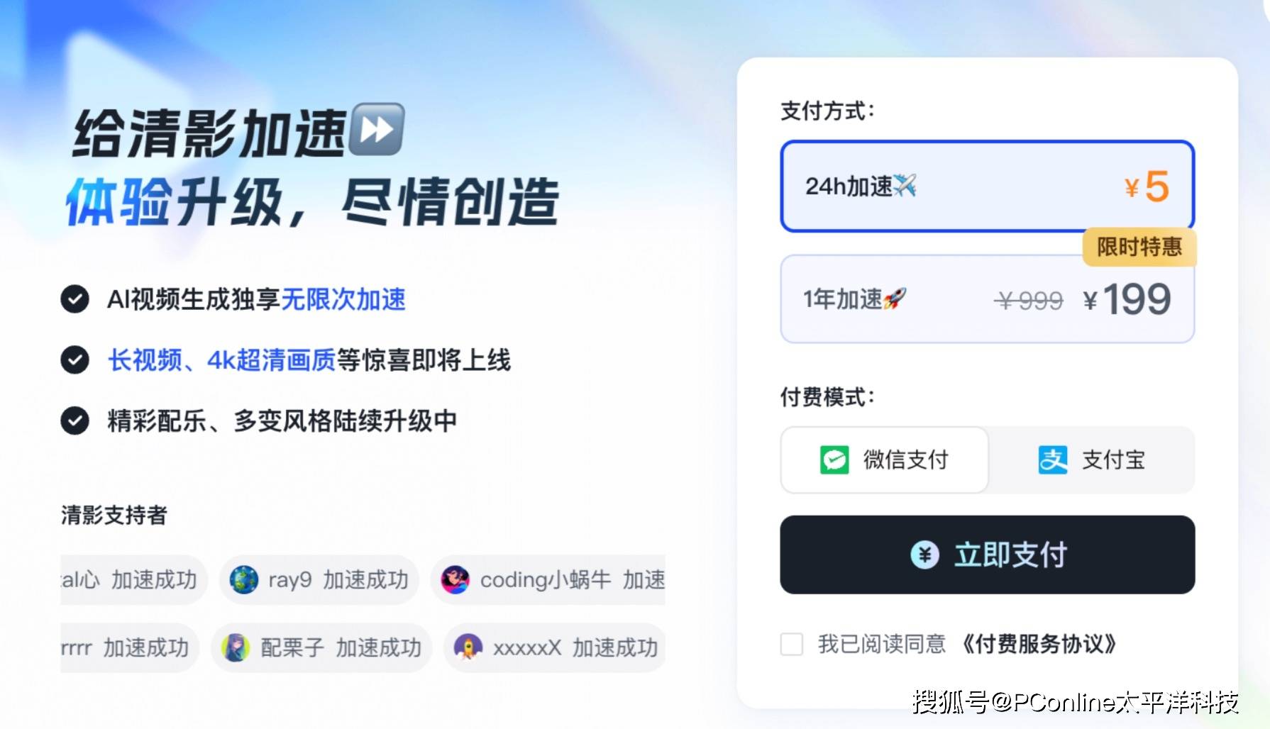 智谱清影推出的是“加速”模式。普通用户使用清影是无限次免费的,如果要想缩减排队等待生成的时间,可以购买加速券,5元加速一整天。