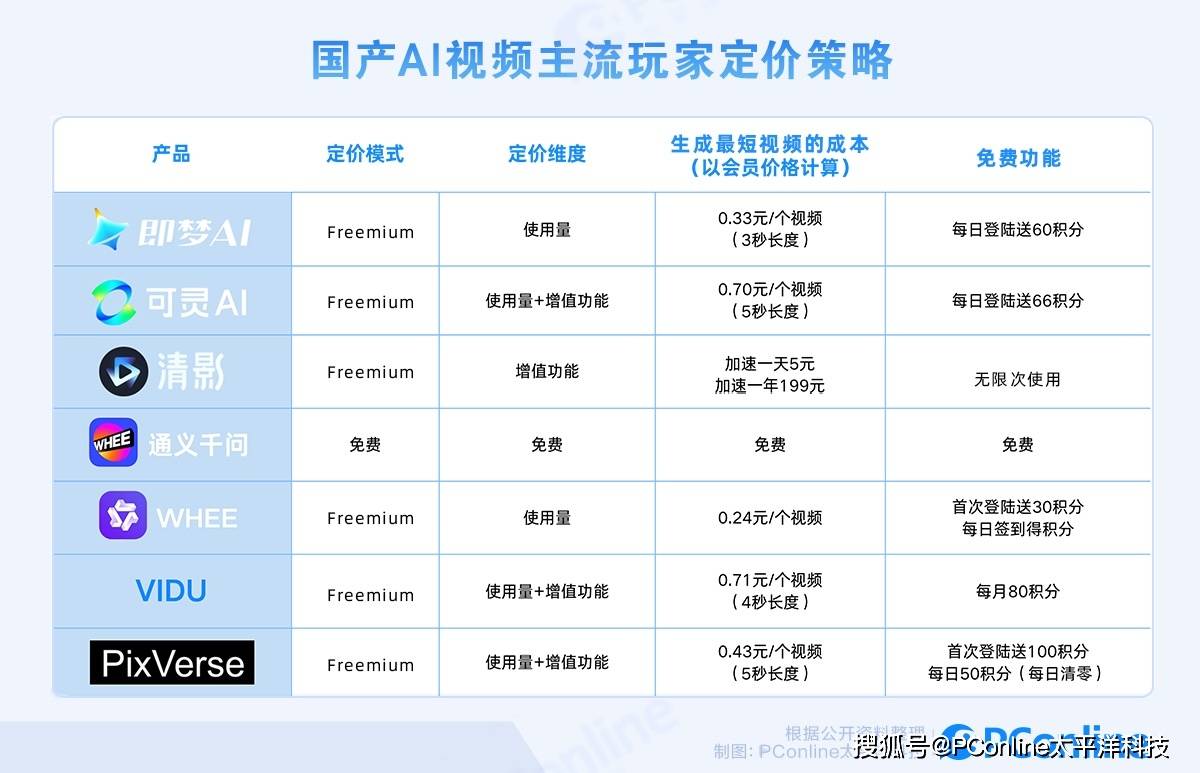 PConline统计了几位主流AI视频玩家的定价策略,发现了许多有趣的现象。