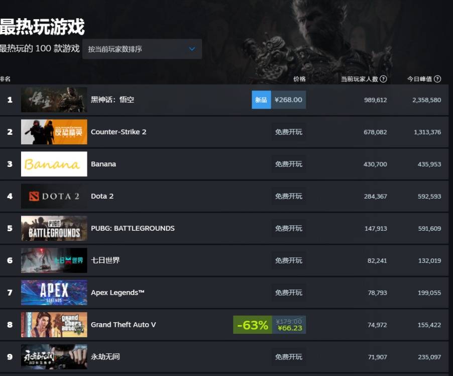 截止至《黑神话:悟空》正式开放游玩第二天早上10点,全球最大的游戏平台steam的峰值玩家人数已经突破230余万,拿下热销游戏与热玩游戏双榜首。
