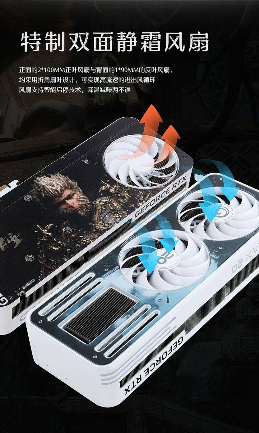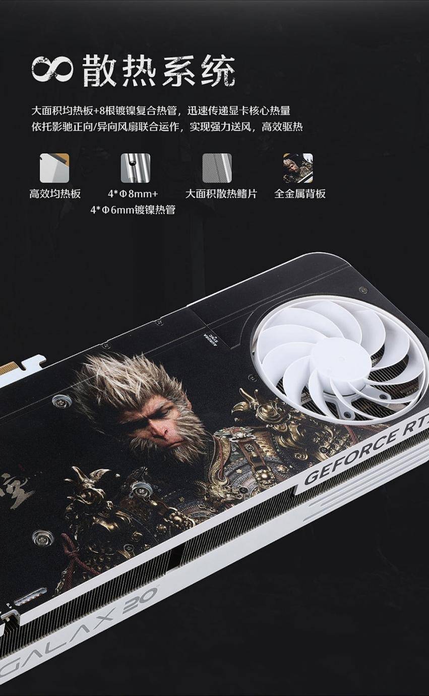 超高的性能自然要搭配高效的散热,影驰黑神话RTX 4070Ti SUPER特别纪念版显卡采用了正面的2*100mm正叶风扇与背面的1*90mm的反叶风扇,均采用折角扇叶设计,配合8根镀镍热管和大面积散热鳍片组成散热系统,快速带走积热。有了这套出色的散热系统,使用影驰显卡长时间畅玩《黑神话:悟空》也不会过热掉帧。