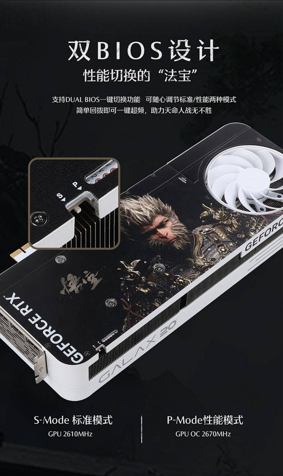 正面的小缺口也有大能力,这时影驰的显卡双BIOS开关,能提升50MHz的GPU加速频率,释放更强性能,比如在《黑神话:悟空》与强力精怪交手时,一键释放更强性能提高游戏帧数,让影驰黑神话RTX 4070Ti SUPER特别纪念版显卡成为“天命人”的制胜法宝。