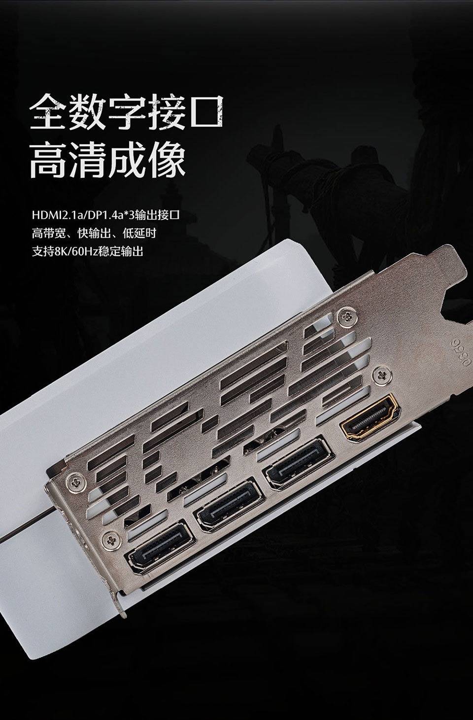 影驰黑神话RTX 4070Ti SUPER特别纪念版显卡在输出接口上用料同样扎实,配备了3个DP1.4a和HDMI2.1a接口,以高带宽低延迟快速输出画面,支持8K/60Hz。金色的HDMI接口是因为这款显卡还搭载了HDMI信号增强芯片,保障接入长距离线材后信号依旧稳定,让你在各种屏幕尽享清晰画面。
