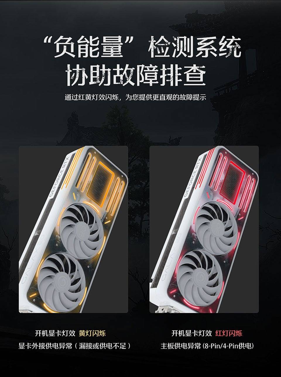 除了在性能上表现优异,影驰在这款产品上还为玩家们设计了诸多方便的细节。除了前面提到的“一键超频”功能,这款显卡还有类似“Debug”灯的影驰负能量检测设计,以红、黄灯效闪烁提供故障提示,帮助玩家快速排查故障。