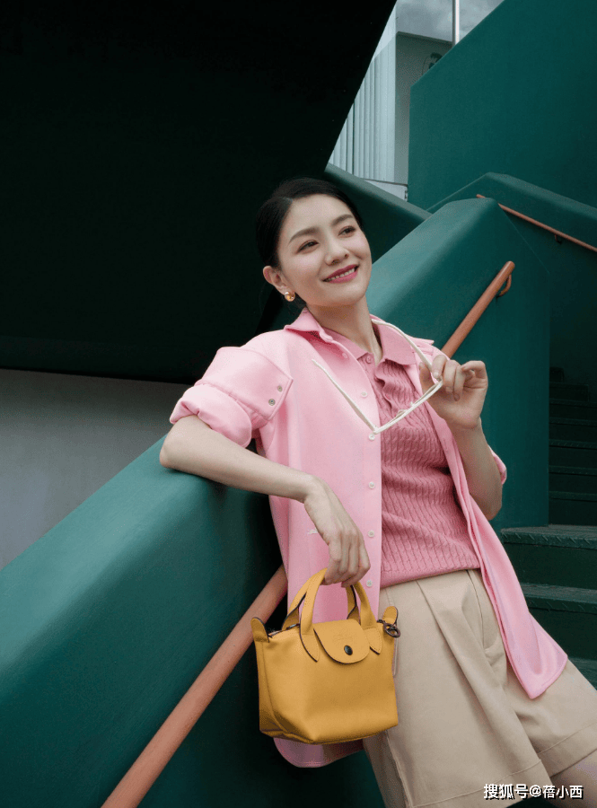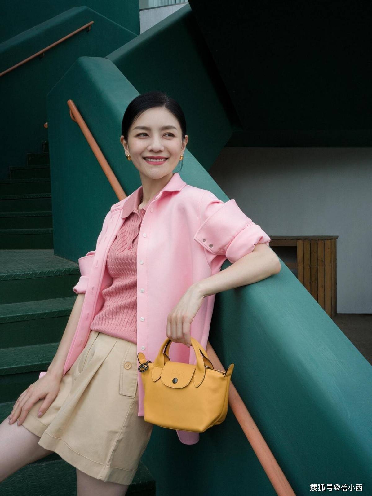 48岁胡可带火了一种新穿法:粉衬衫+针织衫+短裤,时髦洋气又减龄