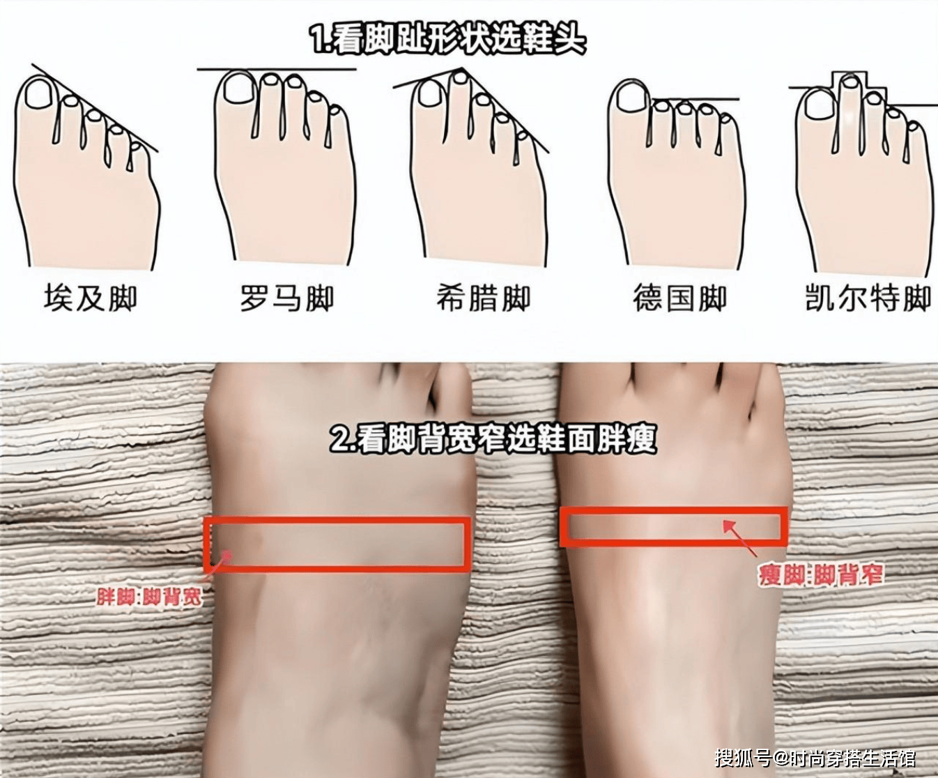 如何让自己的鞋子穿起来最舒适,那就要看你如何根据自己的脚尖形状去挑选最适合你的鞋头设计了。按照脚趾的形状分布,我们可以简单将脚型分为上面这五种:希腊脚,埃及脚,罗马脚,凯尔特脚和日耳曼脚。具体你是什么脚型,相信聪明的你根据上图就能够判断出来了~
