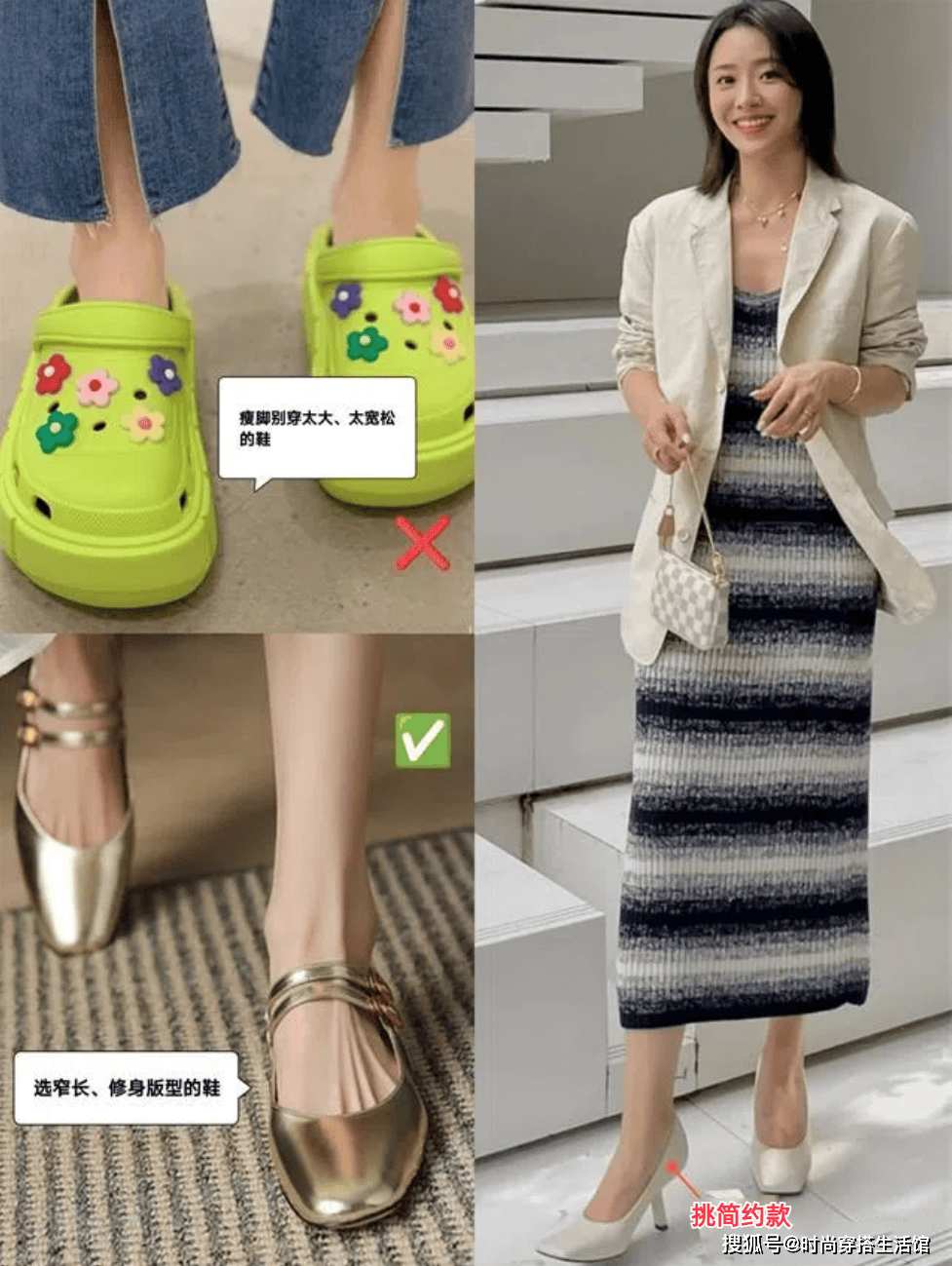 挑选鞋身设计同样窄长的单鞋或高跟鞋会显得身形更窈窕多姿。这些修身的鞋子记得挑纯色或简约版型,结合质感的软皮、麂皮或缎面、丝绒就更贵气了!