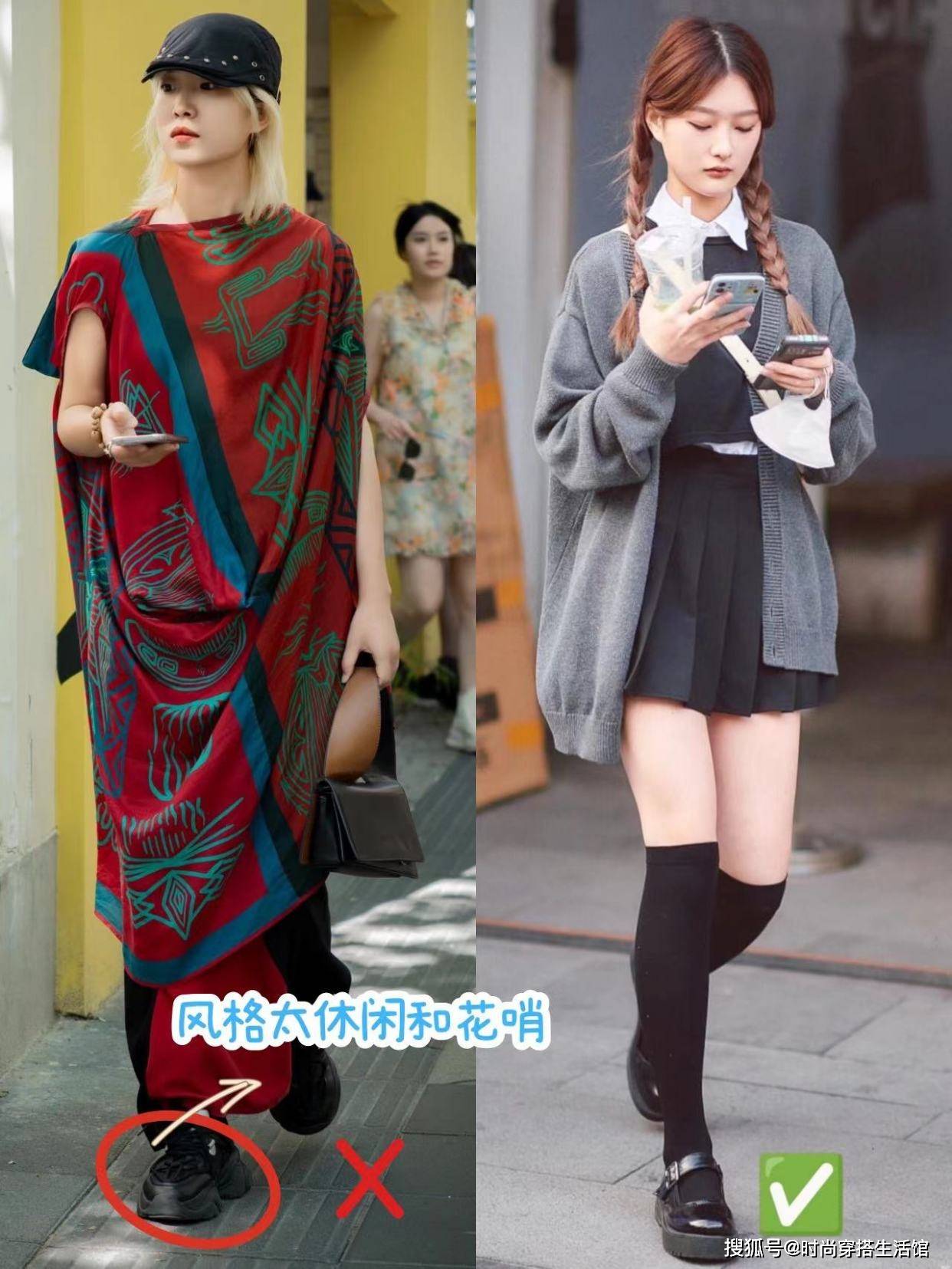 裙子和运动鞋这个组合,有着装风格上的冲突,主要表现在裙子的优雅温柔感,和运动鞋自带的休闲属性很不相符,强行将两者结合在一起,往往会起到反作用。